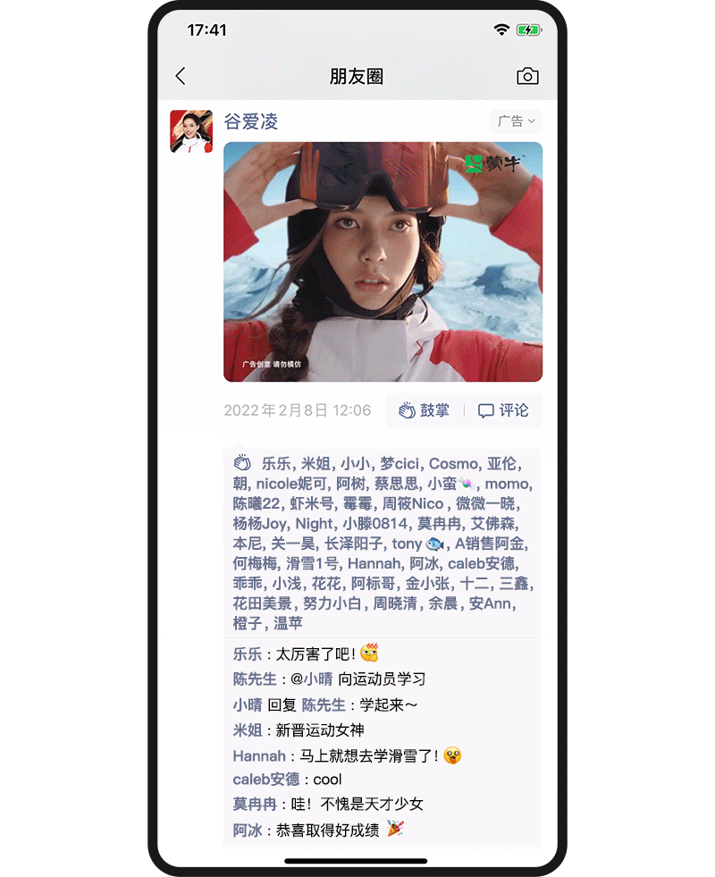 在此次冰雪赛事盛宴期间,腾讯广告定制的朋友圈喝彩广告将朋友圈广告点赞功能首次升级,创新的鼓掌喝彩动效,契合用户当下为运动员喝彩的情绪表达,通过强互动引发品牌与用户的强共鸣,广告点赞率超出大盘均值3倍+,成为体育赛事节点营销的新标配。