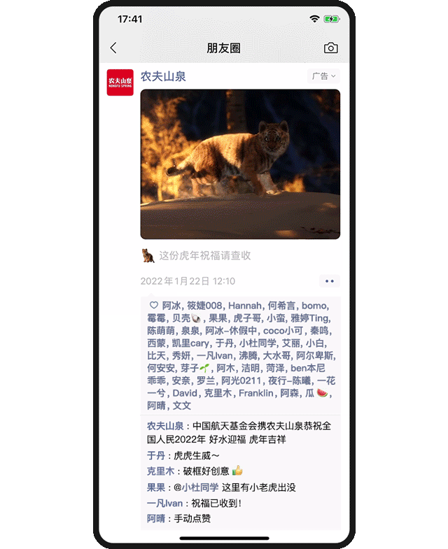今年新春营销的刷屏级产品,朋友圈摇动式卡片广告在互动、动力、社交三方面升级为消费者更添“好彩头”,以限定的红包封面奖励,高效提升消费者交互意愿。同时,消费者摇动手机获得红包封面奖励后,还可以分享邀请好友一同参与互动;全新异型红包封面和红包封面赠送卡等惊喜彩蛋,大大提升用户社交分享意愿,让品牌曝光实现更广更深的“病毒式”扩散。通过升级社交彩蛋玩法,互动点击率超大盘均值 1 倍+,分享率超大盘均值 3 倍+。