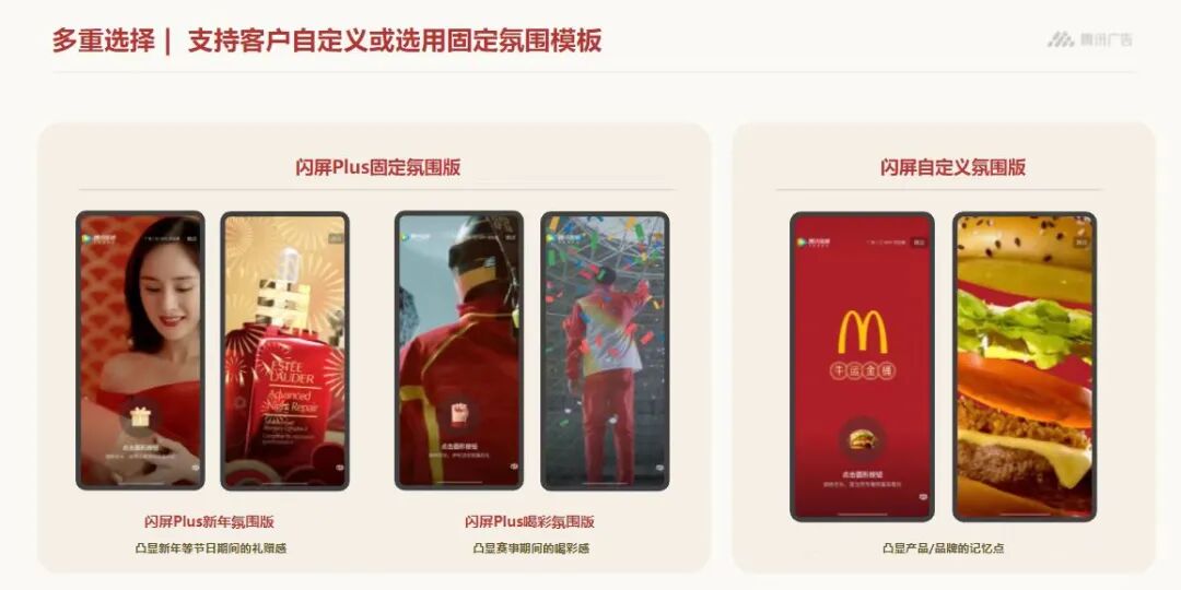 以闪屏广告为例,作为构建品牌力的重点产品之一,以传播力强、覆盖面广等优势受到品牌青睐,腾讯广告在原有的产品基础上,对样式做了进一步的交互提升。