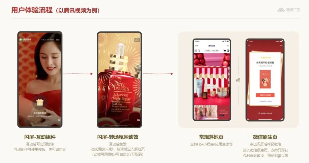 首先,落地页升级,通过好看好玩的广告吸引用户互动,点击后触发转场氛围动效,播放结束后自动拉起落地页,整个过程流畅丝滑。同时,腾讯广告支持丰富的后链路玩法,可跳转至常规落地页、小程序、电商平台、微信红包封面领取页等,让消费者可购买、可留资、可分享,层层加深品牌记忆。