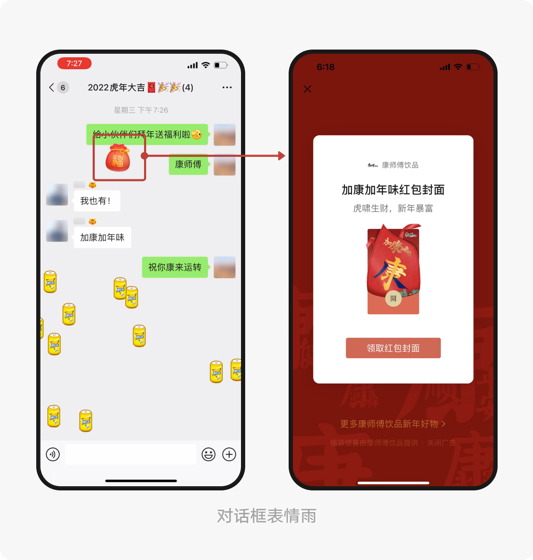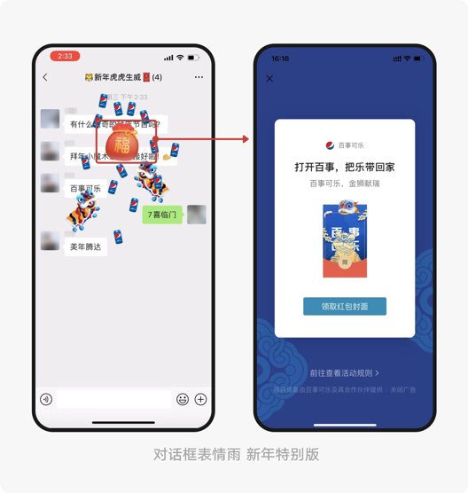 微信表情雨也推出了新年特别玩法:在原有的品牌关键词触发全屏表情雨彩蛋的玩法基础上进一步升级,增加了转化更直接的强化福袋,支持多人互动,整体互动样式更有趣,曝光更持久。