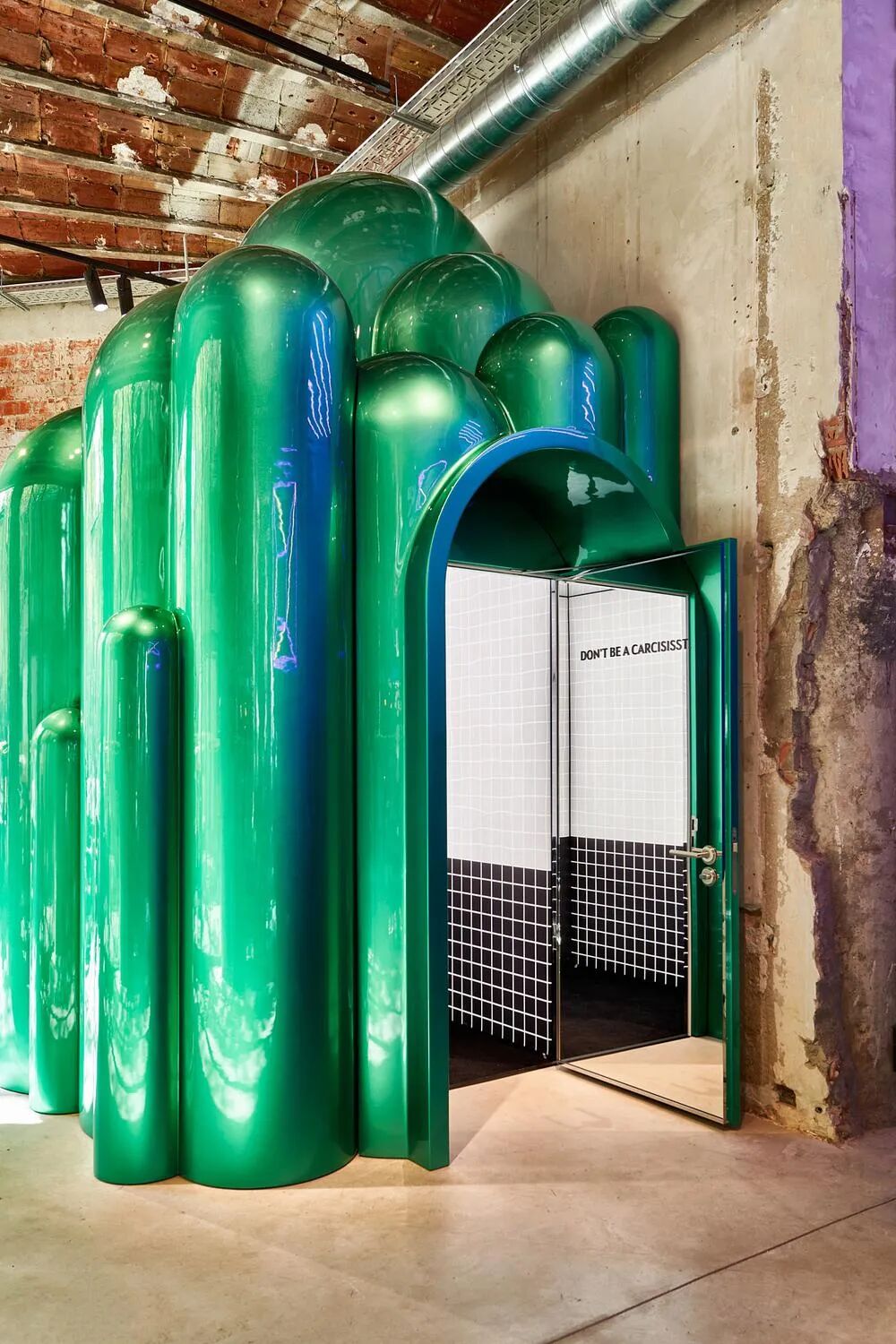入口处,一座造型独特、有着镜面质感的绿色城堡映入人们的眼帘,你绝不会想到,这里面竟然是一处试衣间!柱状扭曲的映射效果从第一眼就清晰地表明设计态度,在巴塞罗那的Lynk& Co俱乐部,不走寻常路!