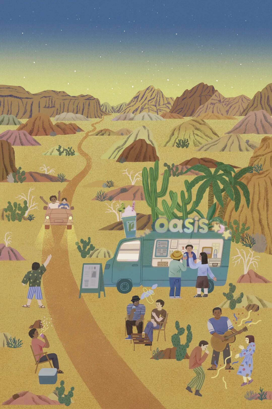 这个夏天也未免太热了吧~!在这样的高温下我们创作了这幅“雪人汗蒸图”。画面以“沙漠与绿洲”的英文作为标题。以流(融)汗(化)的雪人为中心,搭配绿洲里的椰树和雪人的几个小伙伴。希望在这炎炎夏日里带给大家几分清凉。