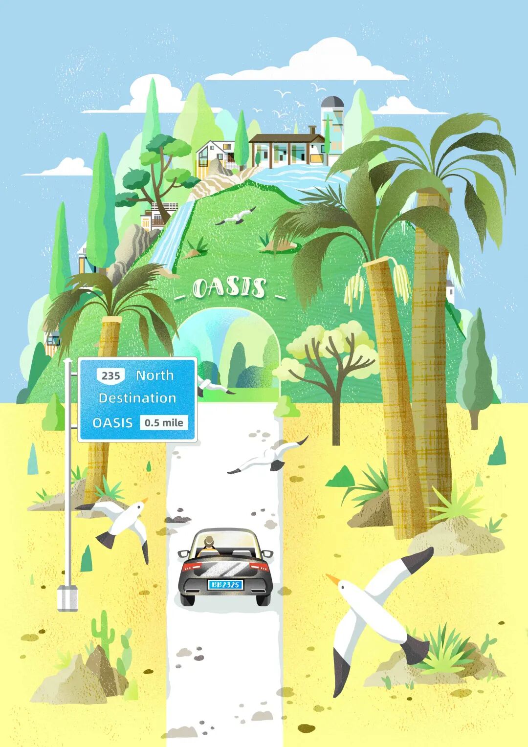 自驾的人穿越漫长的沙漠后最终到达绿洲。就像独自追求梦想的人,在创作的路上坚持并相信自己,最终也会到达属于自己的目标——“绿洲”。