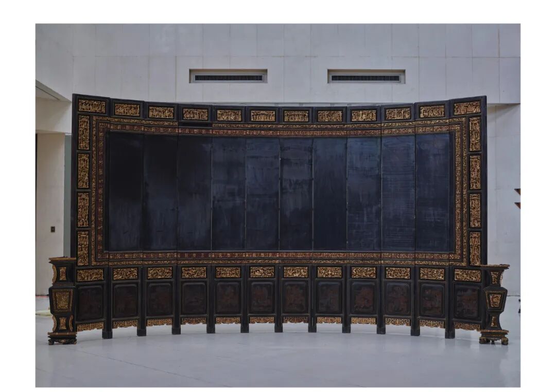 馆藏潮州金漆木雕大寿屏共镶嵌了多层缕空金漆通雕、金漆浮雕和彩漆画共226件,内容有人物故事以及水族、花鸟、博古静物等,又有含意吉祥的篆体汉字“寿”(各个不同)和图案纹样。整座屏风装饰内容丰富,布局有主有从、紧凑整体。如此富丽堂皇、气势不凡的大型潮州金漆木雕器物,能留存至今实为罕见。