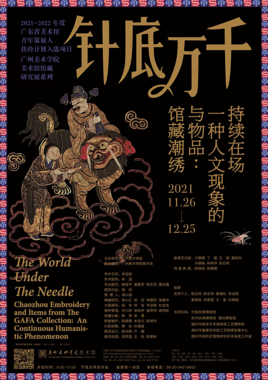 “针底万千——广州美术学院美术馆藏潮绣与物品:一种人文现象的持续在场”于11月29日正式开幕,展览通过对广州美术学院美术馆藏的七十余件潮绣与相关物品进行了深度挖掘与立体展示,反映出潮汕民间生活风貌和民俗精神的同时也呈现出了传统技艺在当代的思考与研究。