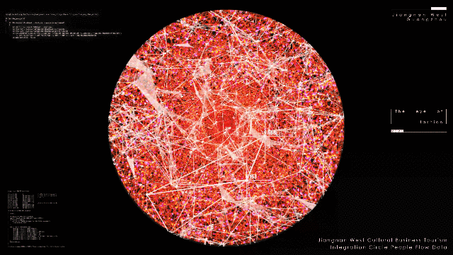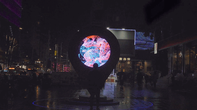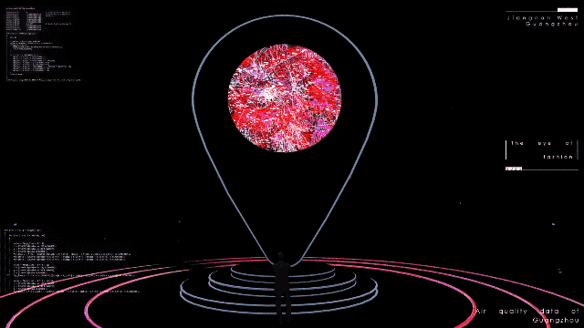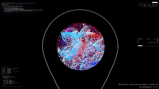 《时尚之眼》Eye of Fashion是一个内部嵌有数字屏幕的人工智能数据生成艺术装置,内容由江南西区域的生活数据(不同时期的天气数据、车流密度、人口流动、交通信号和碳排放等环境信息)以及文化数据(岭南画派画作、历史图片、区域发展大事件)作为驱动,成为江南西能量的画像与数字人文载体。