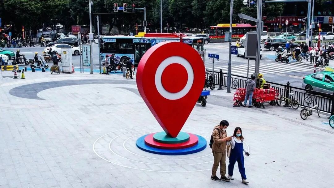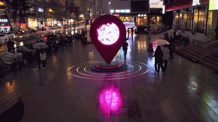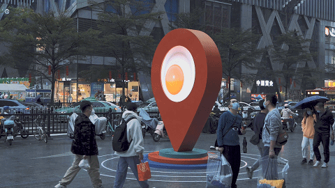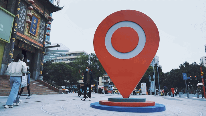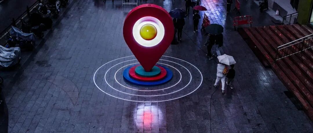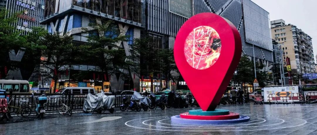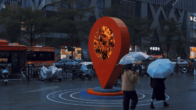 公共性:《时尚之眼》作为标志性的公共艺术,必须考虑其“公共性”的达成。首先,广州海珠江南西商圈是广州时尚潮流的风向标,是广州年轻人最喜欢的聚集地之一,带有浓厚的“老广”记忆,而“在江南西A出口等”、“发江南西的定位给我”等话语也经常出现在老广人口中,所以装置所处区域可以说是整个江南西最具“公共性”的区域。其次,“导航定位”的符号,对于观众来说是没有认知障碍的,任何观众都可以读懂,具有很强的传播性。并且,装置既能突出主题,又能融合周边环境,达成公共性的呈现。