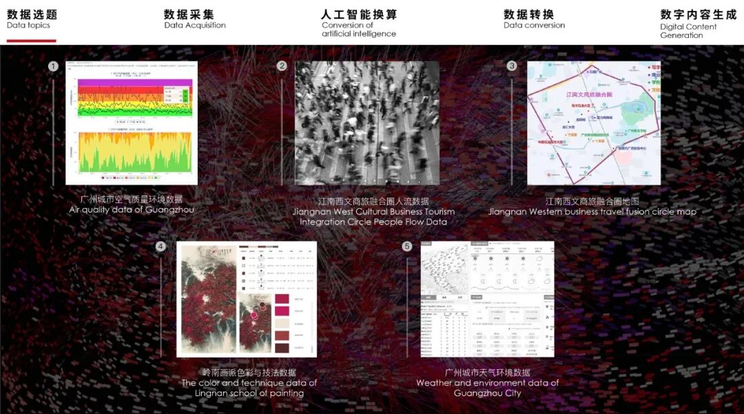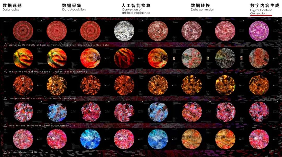 因此,作为广州海珠江南西的新地标,装置希望链接岭南文化的过去与未来,继承前人的创新探索精神,创造性地利用算法生成艺术的方式,把“岭南画派”的经典画作元素进行解构重组,使用数据压缩、算法处理、图像生成等方式,把岭南画派的特征信息转化为令人惊叹的视觉内容,这些数据通过装置本身,呈现出一个奇异科幻的新“岭南”感官体验。