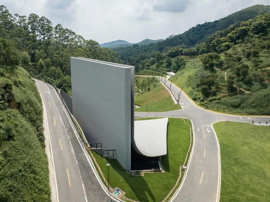 建筑形态的设计经过多次的简化,得到最简洁的两条线:一道笔直刚强的直线构成24米高的墙;一道柔和舒展的曲线构成从水平过渡到垂直的曲面屋顶。形态如男女共舞。结合周边的地形,用最简约的建筑形体与周边的自然山体林木和谐共存,创造充满力量同时令人舒适的视觉冲击。