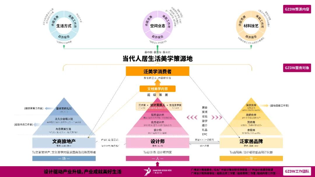 以此价值主张作为衡量的维度,广州设计周对“人居生活美学策源地”的目标非常清晰,做更具有探索性,系统性和趋势性的研究。关注当代人居生活美学,将策源研究的内容落脚于聚焦“材料技艺、空间业态、生活方式” ,更是对研究内容和领域的进一步细化。从内容链接到的每一个侧面,每一个群体不难看出,人居生活美学的大范畴里,对商业推动,行业赋能,人居趋势及消费群体生活方式的方方面面,都进行了有序的,环环相扣的链接与互动。