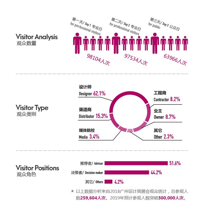 2018年广州设计周第一次采用收费入场,人气不减反增,展会观展人数高达259604人次,同比2017年增长24%,其中设计师、渠道经销商组团观展的城市达到83座,辐射千千万万的设计产业人士,火爆人气继续稳居中国目前规模最大、参与人数最多、影响力最广的设计+选材博览会的地位。