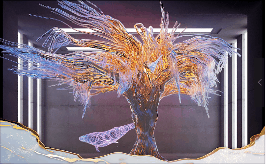 点点星火聚成火的意志,闪耀在魔方中又含无尽变幻;火,它在整个空间游走旅行,无形的火为有形的空间赋予全新的活力,就像文化与科技为这个世界带来的希望之光。
