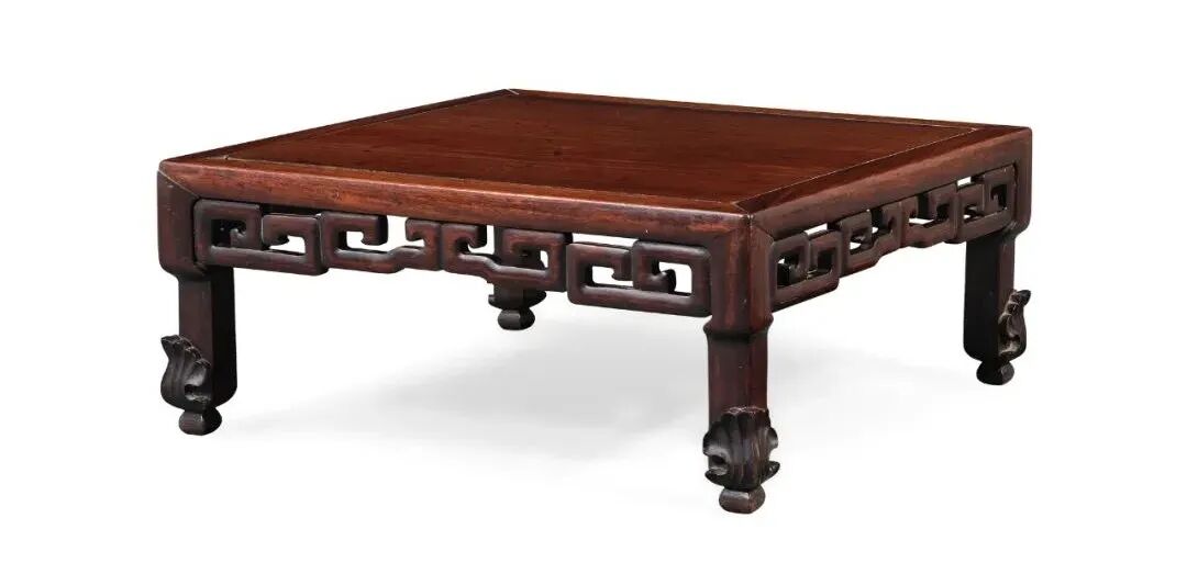 炕桌方形,以红木制,四面平式,圆格角攒框镶嵌独板面心,雕镂拐子纹牙板,疏朗通透。方材三弯腿足以粽角榫与边抹相接,足底外翻卷草纹,踩珠足。