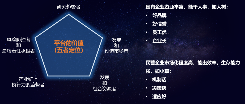 如果企业想成为平台,就要研究趋势,要发现和创造市场,要发现和组合资源,要在产业链上执行监督,要成为风险防控和最终的责任承担者。成为平台就要有价值创造,而不是企业做大了想成为平台就能成为平台,“成为平台就能躺着收钱”。大企业想成为平台就需要具备某些价值,如果成不了平台,未来也有可能成为平台某个环节中的价值贡献者。所以,任何一个企业都应该思考企业自身的价值创造。