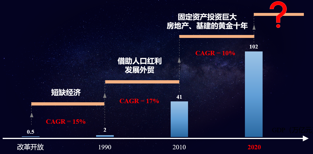 第二个阶段是1990-2010年20年左右的时间,如果纯粹从数值的角度,这20年时间里,中国GDP的复合增长率达到了17%,20年实现了中国经济的大跨越,原因有两点:第一是1990年开始中国的人口红利集中爆发;第二是中国2001年加入WTO,从90年代开始,中国整个就是外向型经济,所以这20年是中国经济发展最快、总量增长最快的时代。