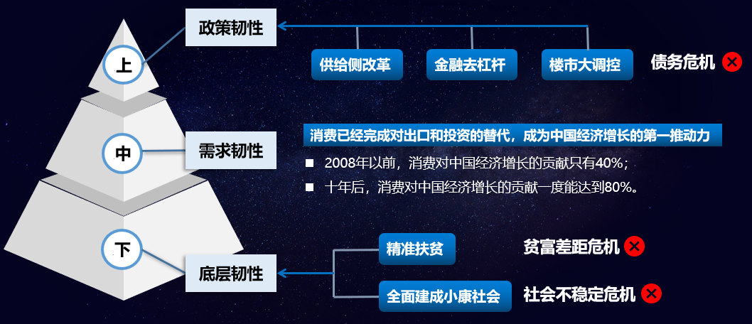 在这样的格局下,我们中国又是怎样的呢?我们的民营企业也越来越重视对国家政策的研究,攀成德公司一直关注并研究宏观经济和政策。过去十几年中国做了几项大的改革,三大危机(债务危机、贫富差距危机、社会不稳定危机)总体是可控的。我们有足够的政策韧性,无论是海航还是恒大事件后,国家都没有采用大放水救市,没有大搞基建拉动,没有放开房地产,国家的政策很笃定,原因是过去十多年我们从政策韧性、需求韧性和底层韧性上做了非常大的改革(图1),使得全世界范围内中国风光独好(或之一),这是我从咨询师的角度对政策的理解。