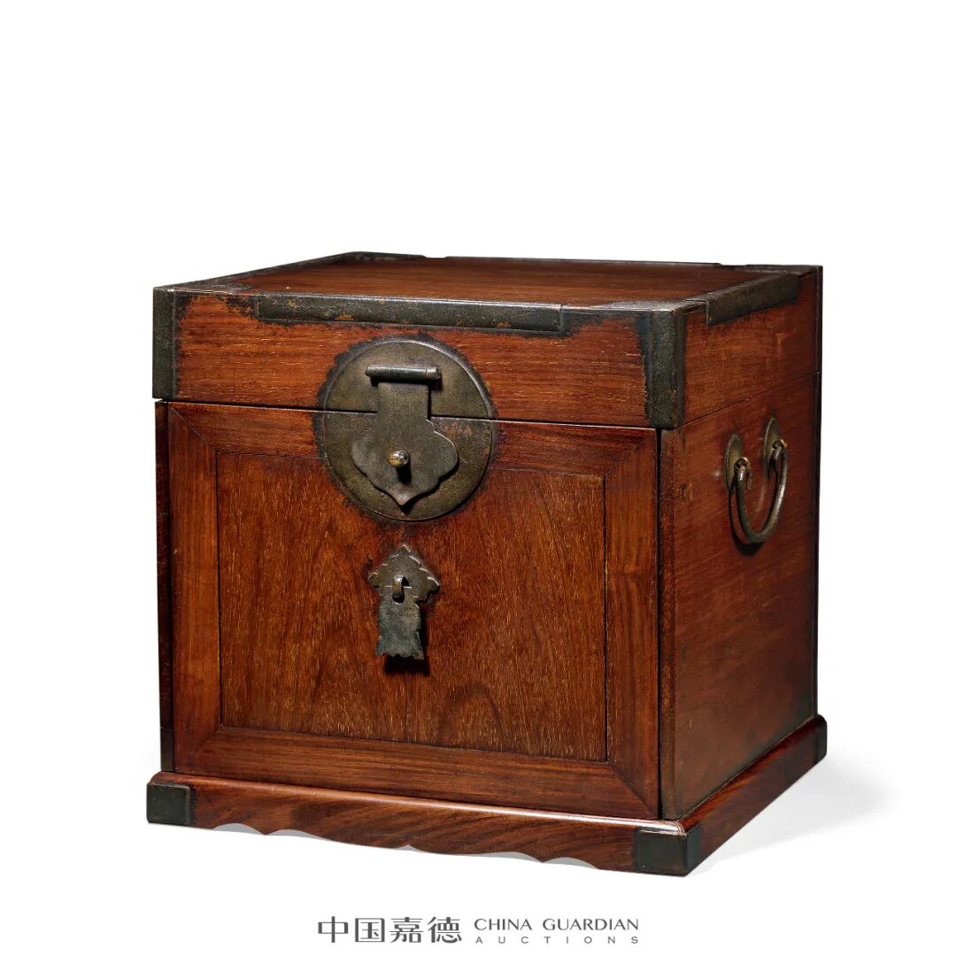 官皮箱的整箱造型为长方体,与宝座式镜台和屏风式镜台相比显得肃穆浑厚,刚多于柔。官皮箱由三部分构成:底座、中部是两门与抽屉和顶部的顶盖,有些还有折叠型镜架。使外形有差异的部位是中部和顶部,中部抽屉前有常见的双门式,也有少见的插门式,顶盖有平顶式也有盝顶式。而官皮箱的便携性则体现在箱体两侧的铜提环。