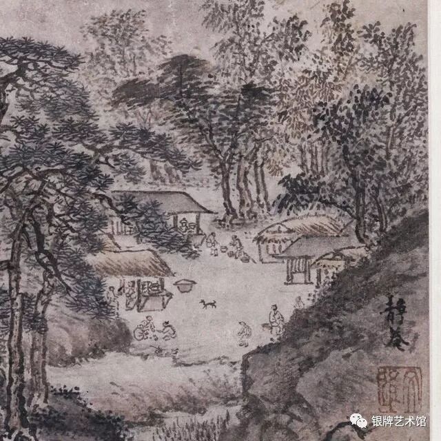 中景村落中几间简陋茅屋,诸多人物活动其间,有卸担询问的行旅人,有招待客人的店家,有闲坐嬉玩的稚童,还有小狗守立村头,这些情节经有机组合,真实地传达出僻远山村简朴、平和的生活气氛。