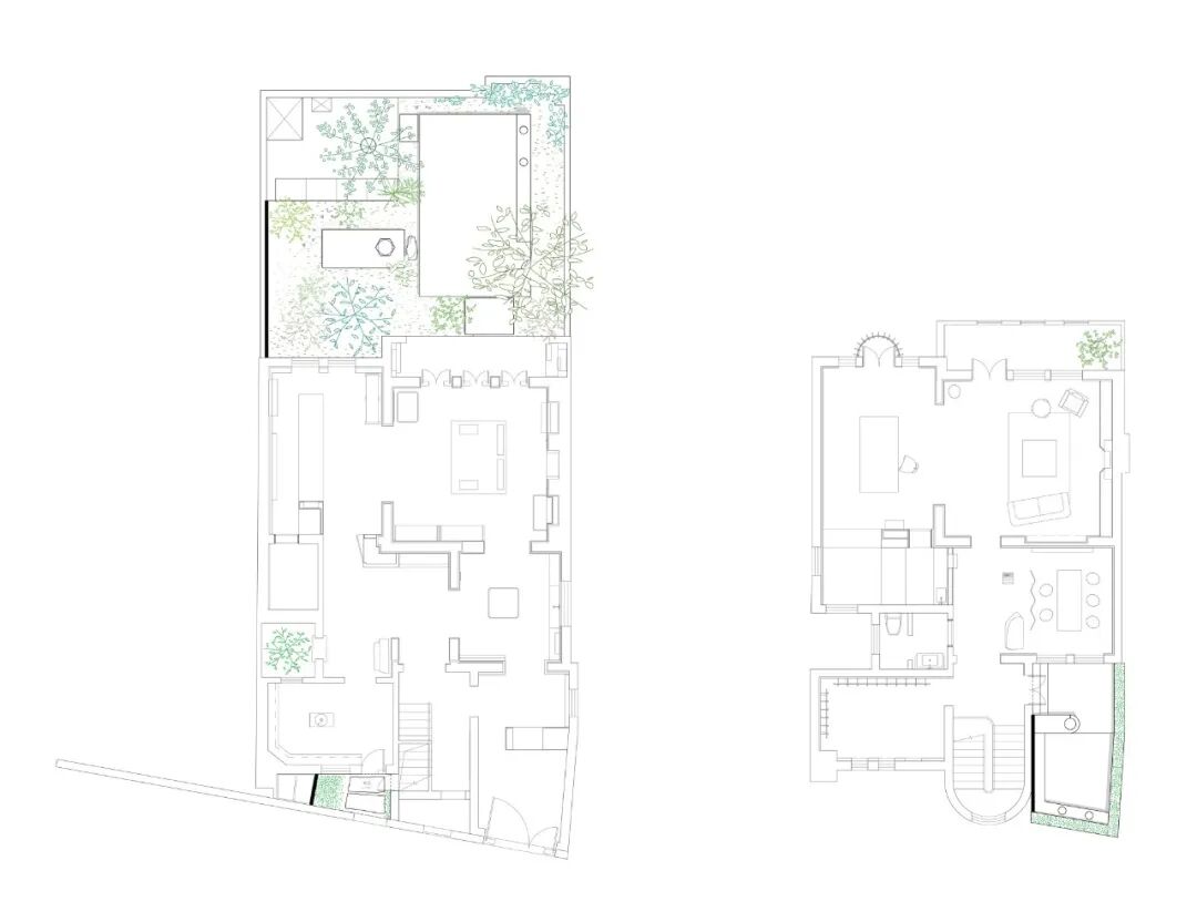 除了对场地现有条件的保留与改造, 庭院中更置入了一面“镜墙”的设计,从竖向上打破了边界。原本有限的空间透过反射,庭院的“绿”一下子被延伸出来。相连的倒影和植物的剪影通过镜面材料的置入,在城市街道里创造出一个奇幻的自然空间。