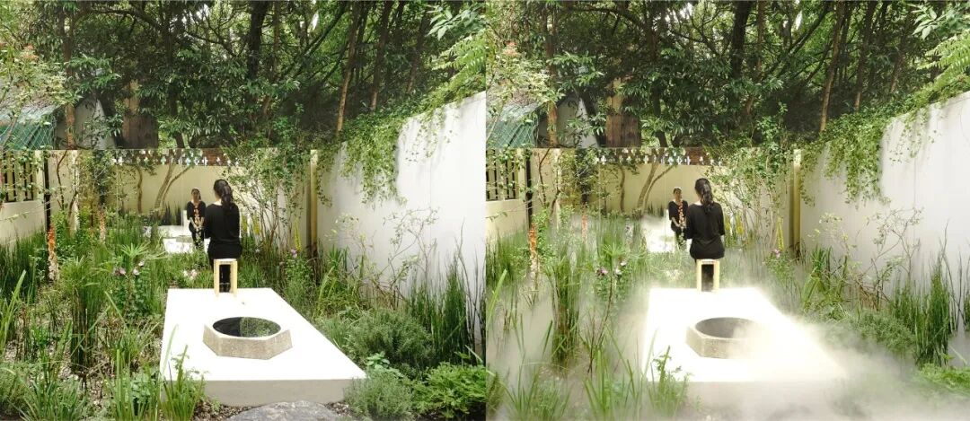 雾森设备的使用也被结合到庭院设计中。雾气弥漫的瞬间,平面上的边界被模糊。雾气的流动试图视觉化地呈现品牌方的专注点:香气。此外,还可作为平日浇灌植栽使用。