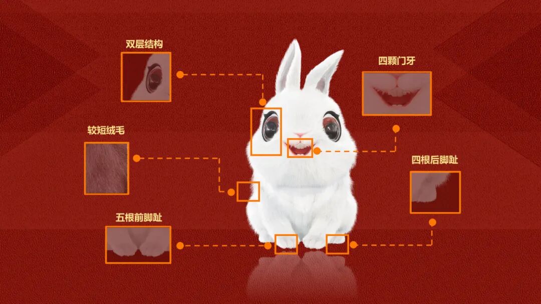 “兔圆圆”有着标志性的四颗门齿,整体形象在中国白兔特征的基础上,融入了传统中国工笔的审美风格,并采用3D立体建模技术完成。竖直的耳朵,微昂的脑袋,挺起的胸脯,彰显出奋进向上的精气神。