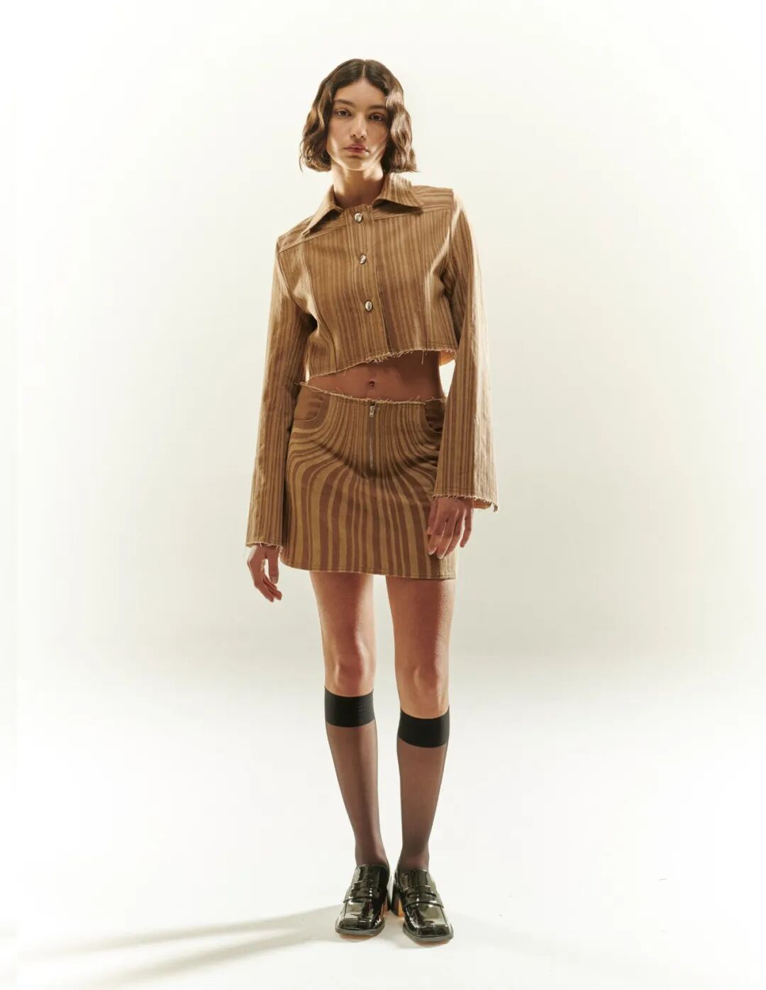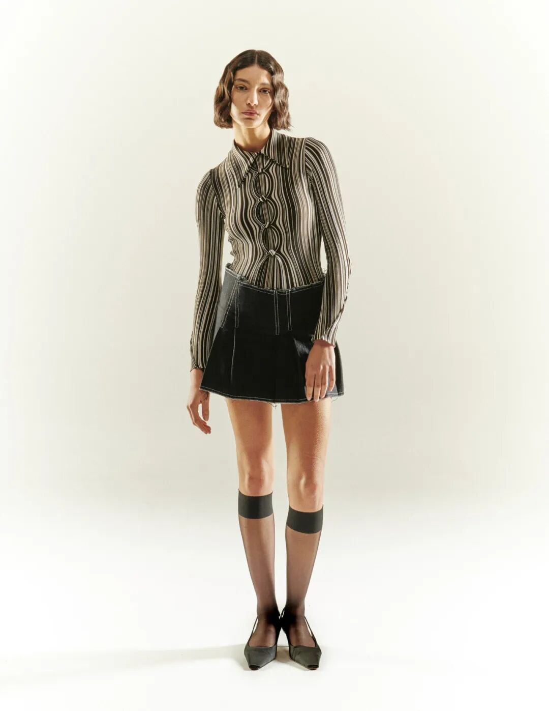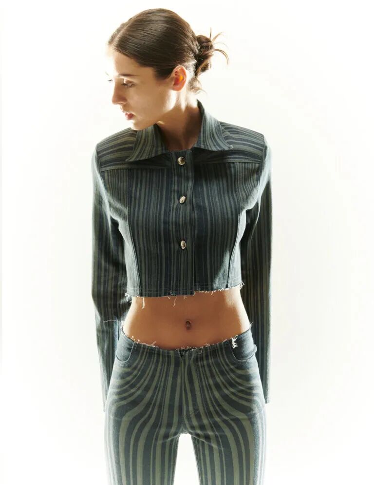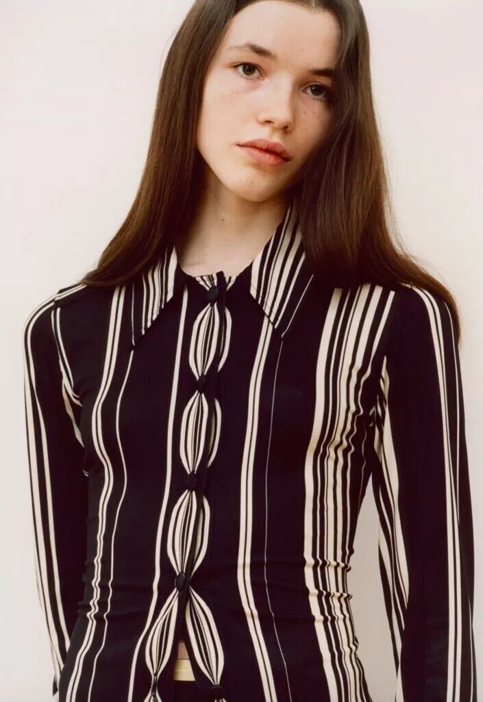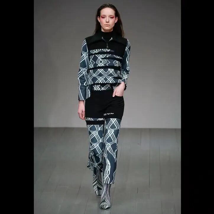 “我为每种风格设计的光学印花是以一种有趣的方式来改变我设计的衣服的语言。在很多方面,它是关于微妙的服装反叛,通过改变和扭曲熟悉的服装细节来创造。”