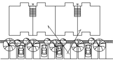 1.在宅间绿化中增植枝叶繁茂、冠幅较大的高大乔木,形成连续的遮荫树冠,以起到夏季改善室内外热环境和降低建筑能耗的作用。(如下图)
