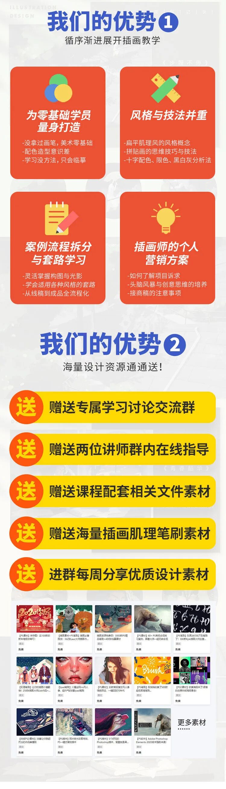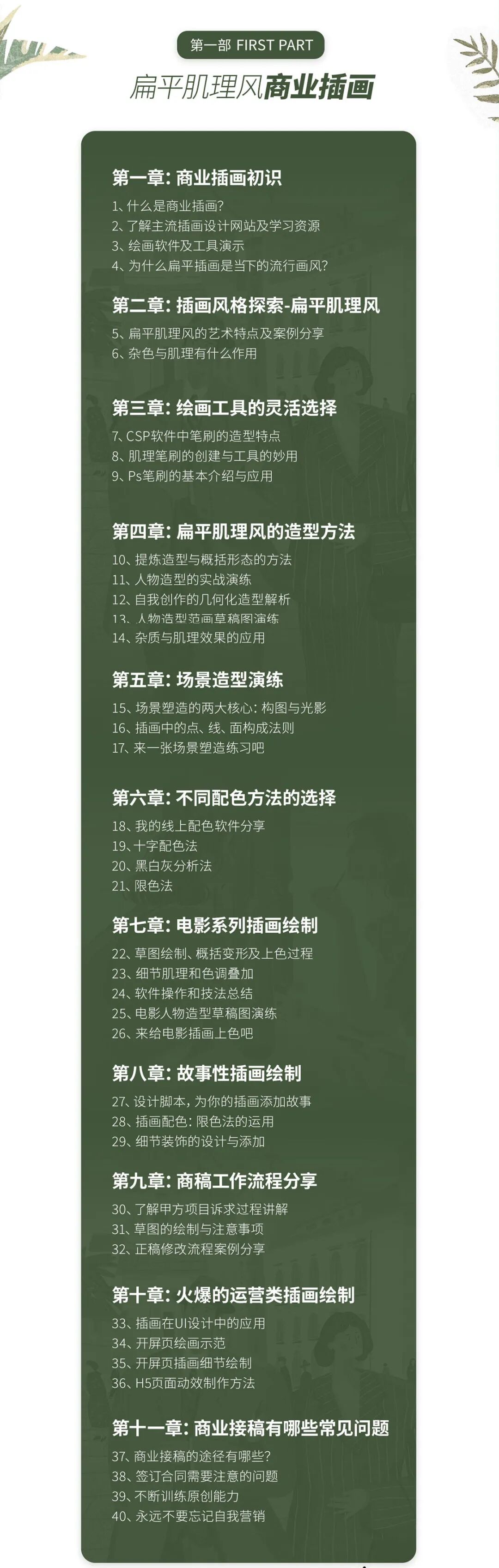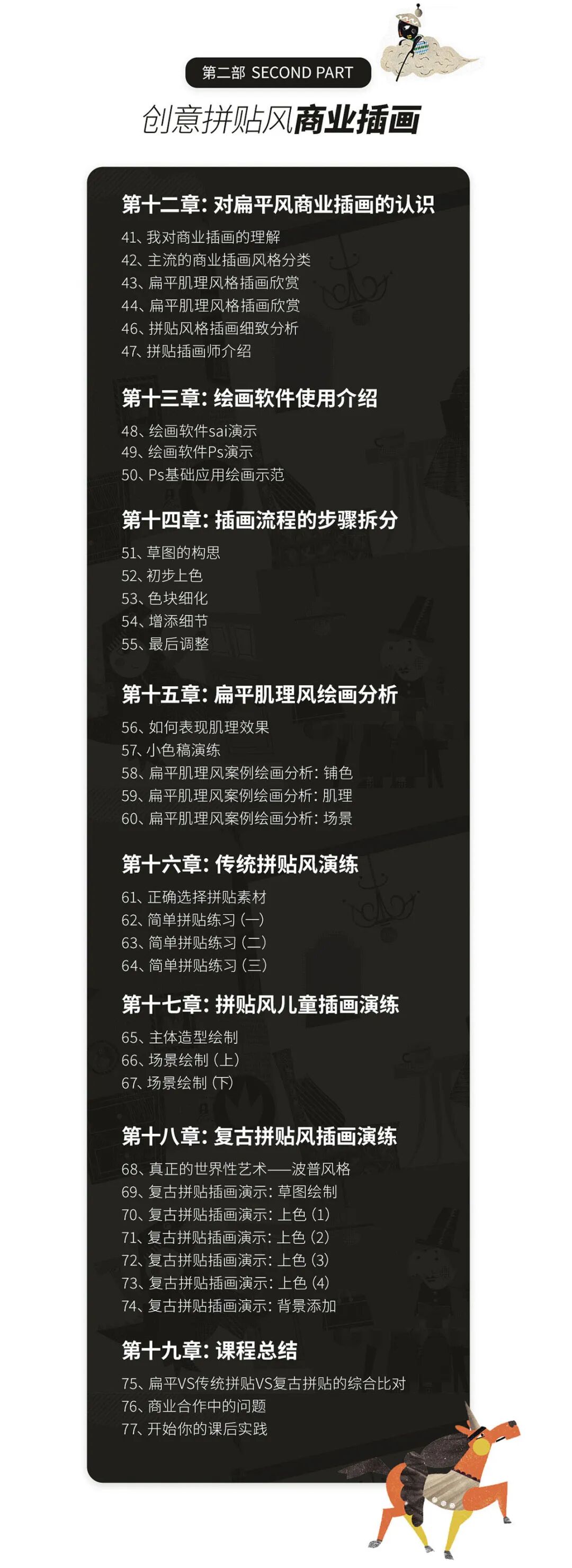 课程涵盖大量插画技能,从零开始。双导师制,由两部分组成,共计19章,77课时。