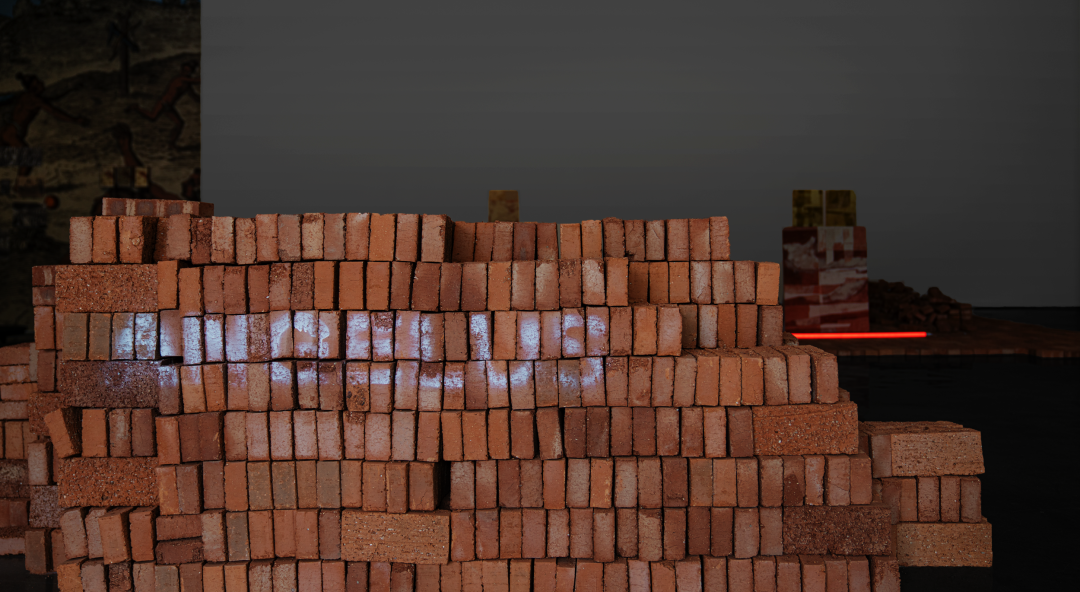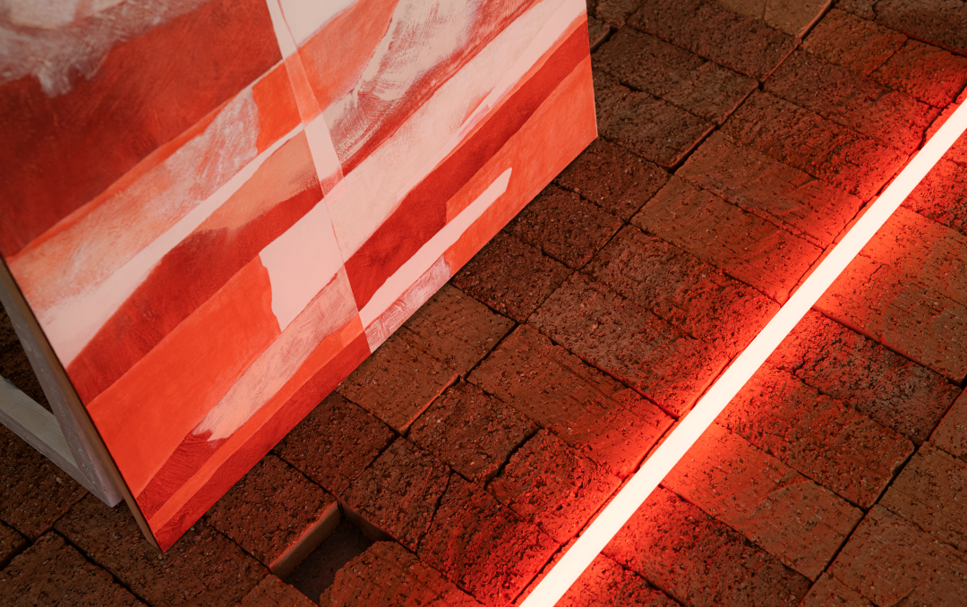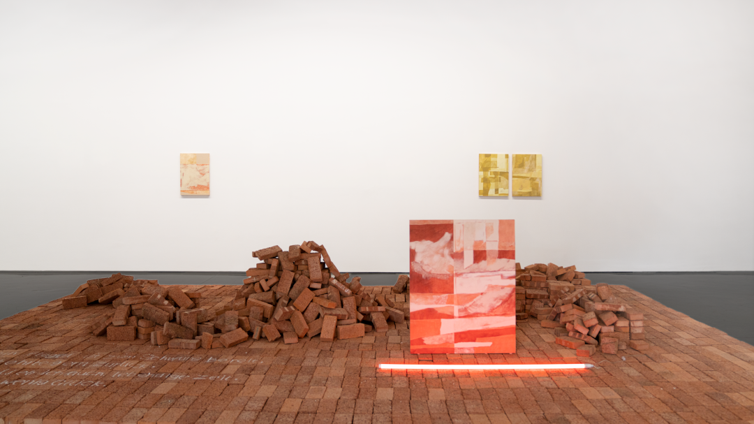 进入展厅,我们看到的第一个展览项目是汉娜·贝纳西(Hannah Benassi)的「A N G E L U S」,"A N G E L U S"在拉丁文中意为“天使”。通过援引汉娜画作中的色彩与材质,将展览现场打造成一片由红砖铺满的“废墟之地”,再将「A N G E L U S」自由而随意地用白色喷漆薄喷在位于画廊门口的红砖垛上...