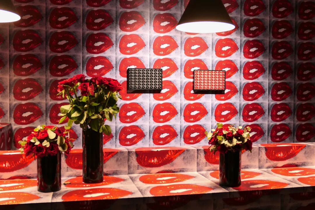 在一层展厅中,除了这些大尺幅的帆布丝网印刷作品,还有一个独特的空间,这个空间还原了2005年新宿黄金街著名的红唇酒吧(Shinjuku Golden Gai Lip Bar)。从两侧印有黑白唇齿的墙面中通过,转角便可看见鲜艳的红唇空间。其中也展出了森山拍摄的丝袜作品,而在吧台的后面也挂着两幅尺寸较小的红唇作品,一幅是鲜艳的彩色作品,一幅则是黑白作品。可以看出这样罗列式的排布呈现出较强的装饰性效果,在影像艺术作品的售卖上也会占据一定的优势。