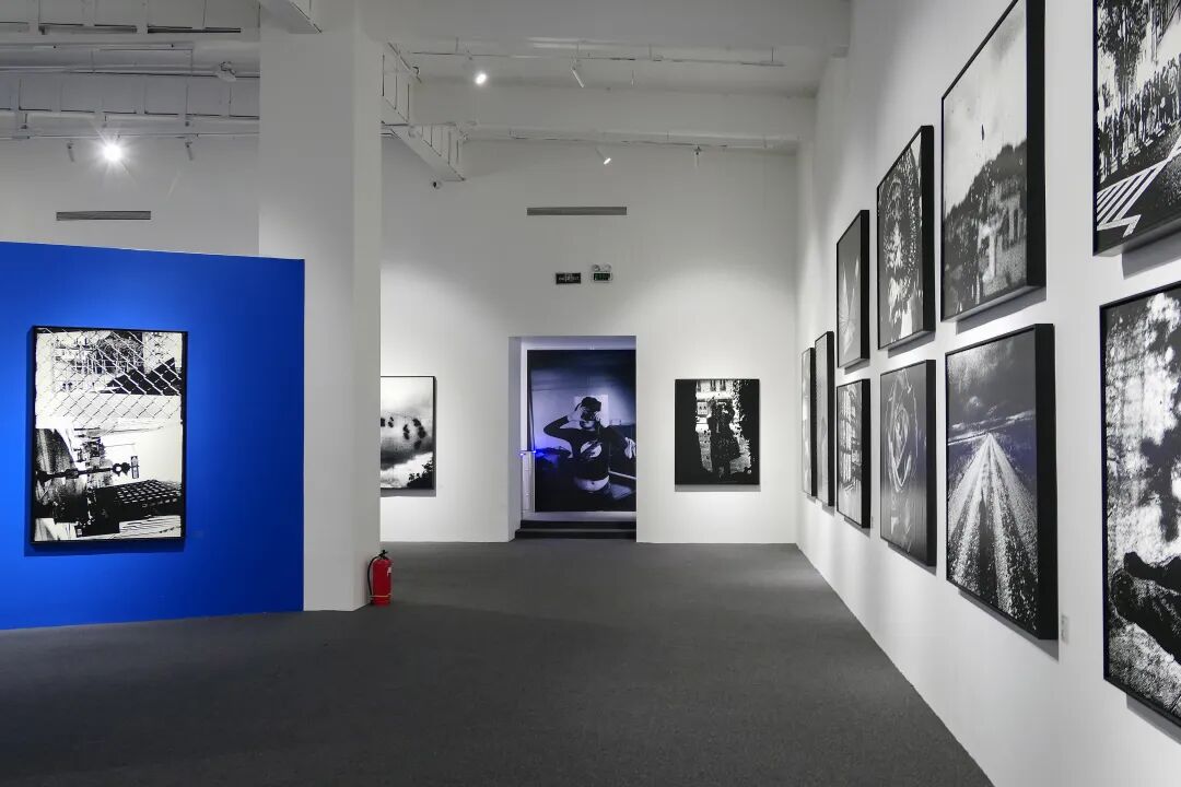 来到展览,在入口处就可以看到森山大尺幅带着口罩的自拍照《无题(来自记录4)》,似乎也预示着疫情下的特殊时段。在这幅自拍照的背面便是展览的前言,介绍了展览的相关信息。在一层的主展厅中,有一道克莱因蓝的墙伫立其中,也悬挂展出着一些作品。