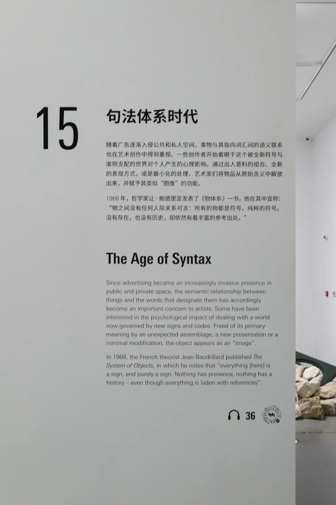 第十五章节“句法体系时代”,反映了随着广告逐渐入侵公共和私人空间,事物与其指向词汇间的语义联系也在艺术创作中得到重视。1968年,哲学家让·鲍德里亚发表了《物体系》一书,他在其中宣称:“物之间没有任何人际关系可言:所有的物都是符号,纯粹的符号。没有存在,也没有历史,却依然有着丰富的参考出处。”所以我们在此处看到不同物品之间重组的艺术作品,通过物本身的符号象征组织新的语言。