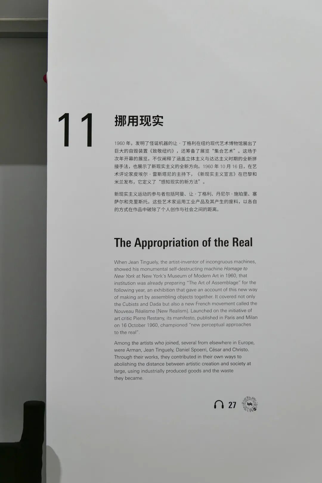 在第一展厅的最后一个章节中(第十一章节),介绍了新现实主义的萌生,1960年10月16日,在艺术评论家皮埃尔·雷斯塔尼的主持下,《新现实主义宣言》在巴黎和米兰发布,它定义了“感知现实的新方法”。
