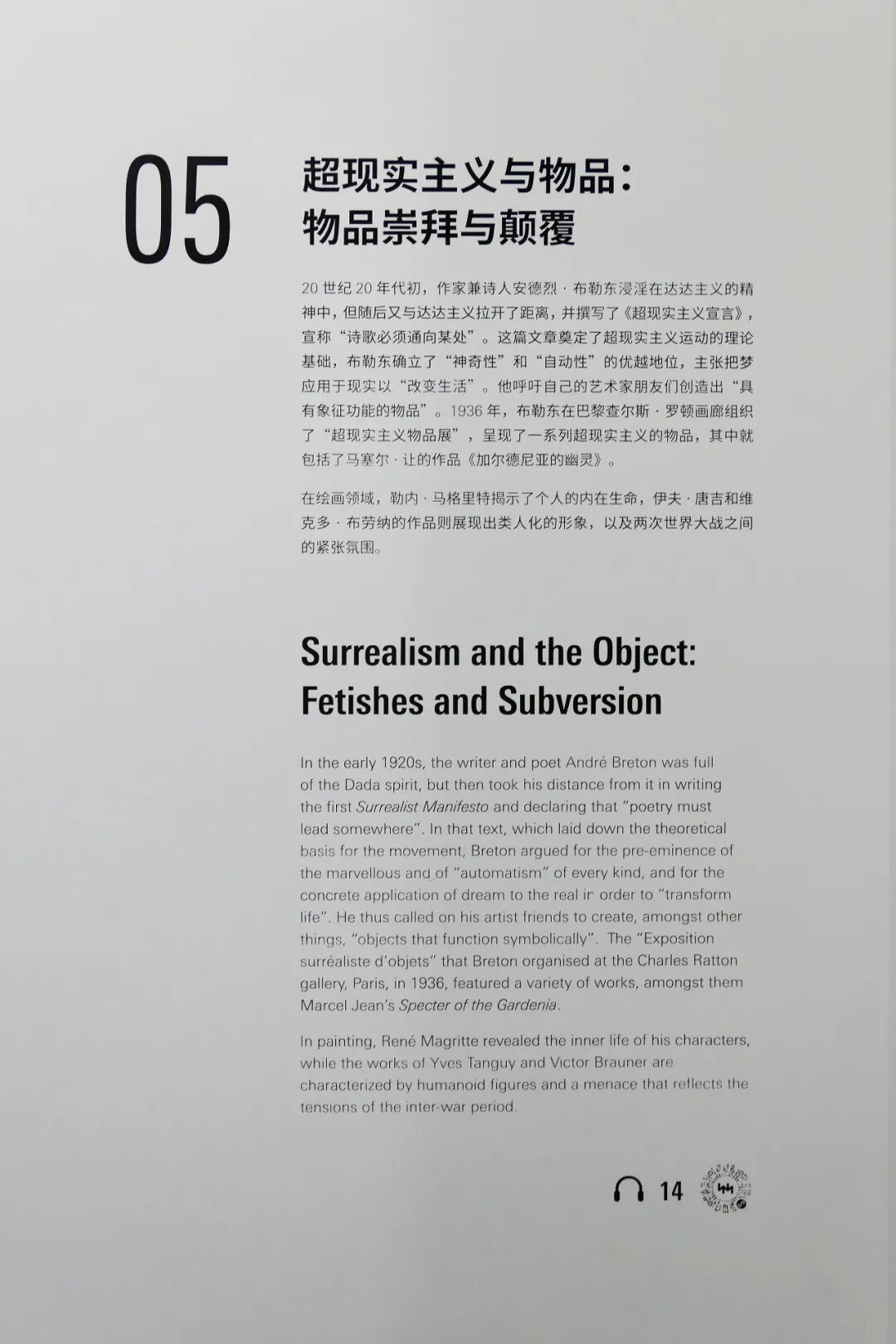 在第五章节里,又可以观看到超现实主义作品的萌芽,1936年,布勒东在巴黎查尔斯·罗顿画廊组织了“超现实主义物品展”,呈现了一系列超现实主义的物品,其中就包括了马塞尔·让的作品《加尔德尼亚的幽灵》。而随着历史时间线的推荐,在伊夫·唐吉和维克多布劳纳的作品中则展现出类人化的形象,从中也可以感受到两次世界大战之间的紧张氛围。因此在第六章节里就过渡到二战期间的艺术家对超现实主义理念的迭代。1953年罗兰·巴特在《物之世界》中写道:“充满爱意地刻画微不足道的表面,而不刻画任何其他事物,已然是一种非常现代的静默美学了。”