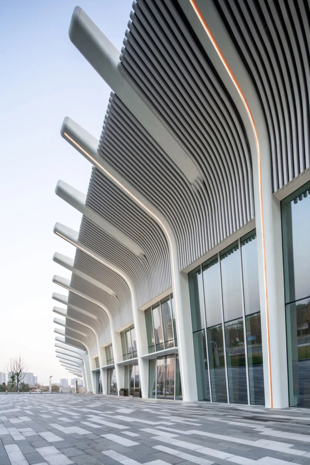 “关联”则体现为建筑端部精心塑造的“Y型柱”结构,促使建筑主体、场地、景观三者关联在一起,进而交融成景。