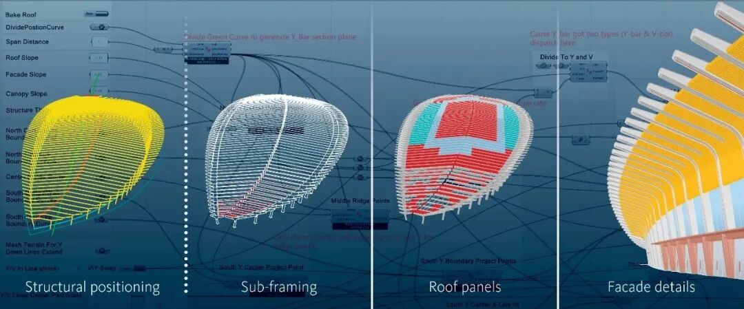 为了更加高效且精确地设计这一复杂的几何建筑,Gensler建筑团队在设计过程中引入参数化设计。通过构建高度定制的参数化模型,设计团队只需更新一个参数,算法就能自动完成所有相关的更新,免去设计师单独负责更新每一个设计元件的环节。这一智能化方法的引入大大提高了项目效率,也让整个装配和建筑过程更加标准化。