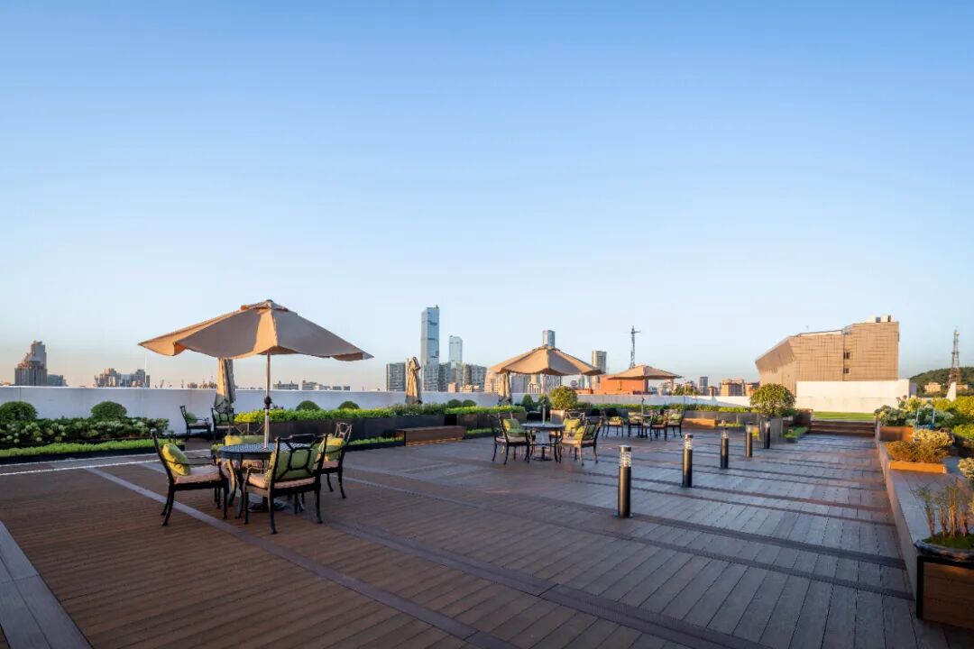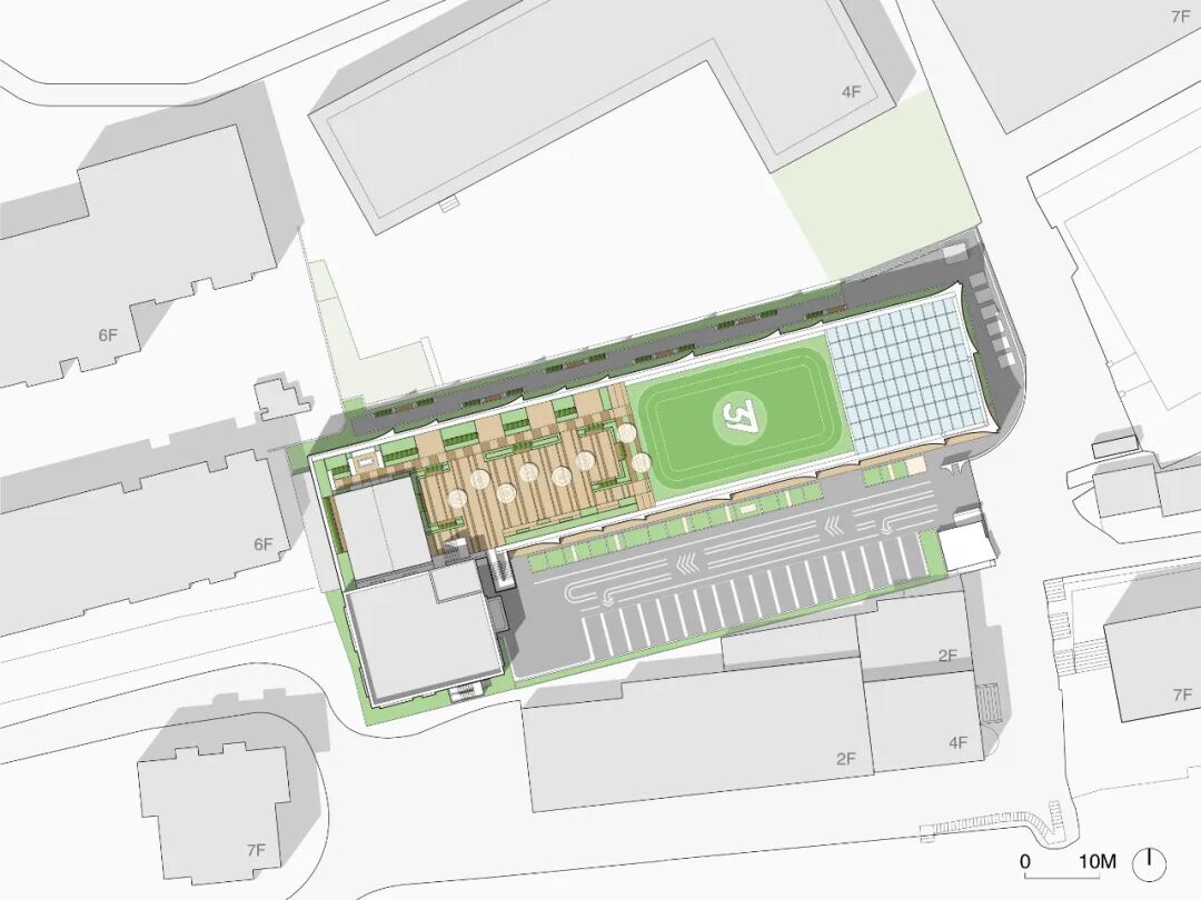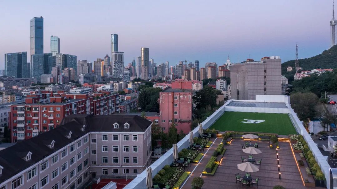 园区内包含中央庭院、北庭院和屋顶花园三部分景观,采取从公共到私用的层级过渡。中央庭院由建筑群和护坡坎围绕,形成类似于传统街道一般的舒适比例,是整个园区的公共交通核心。北庭院形态狭长,成为底层店铺的户外延展空间,具有半私密属性。屋顶花园视野开阔,设有运动场与户外休闲聚会区,可作为私人定制的专属活动空间。由此北望,密集错落的老城肌理,高耸时尚的新城天际线,以及楼群缝隙间依稀可见的海湾与远山,以一种近乎隐喻的方式映衬了大连三十相对于历史、当代与自然的融合。