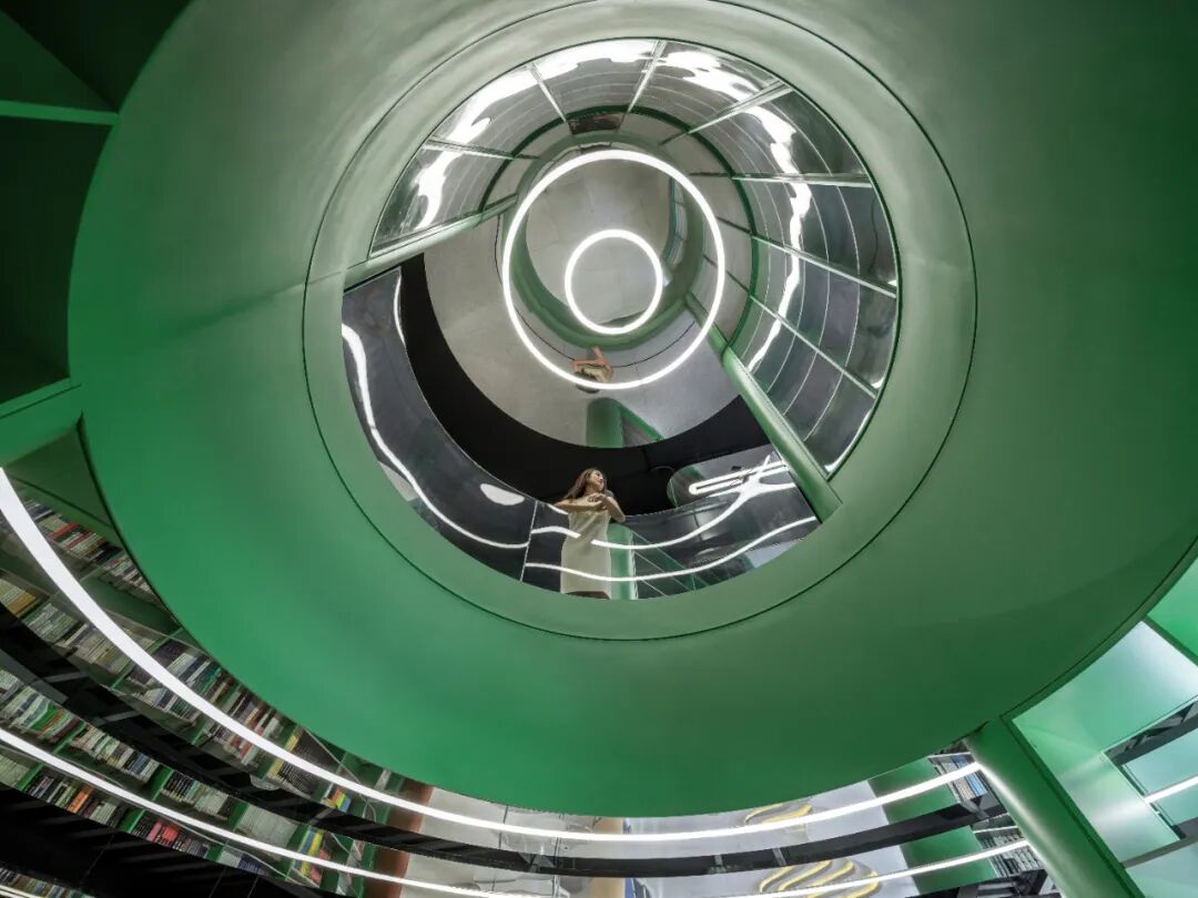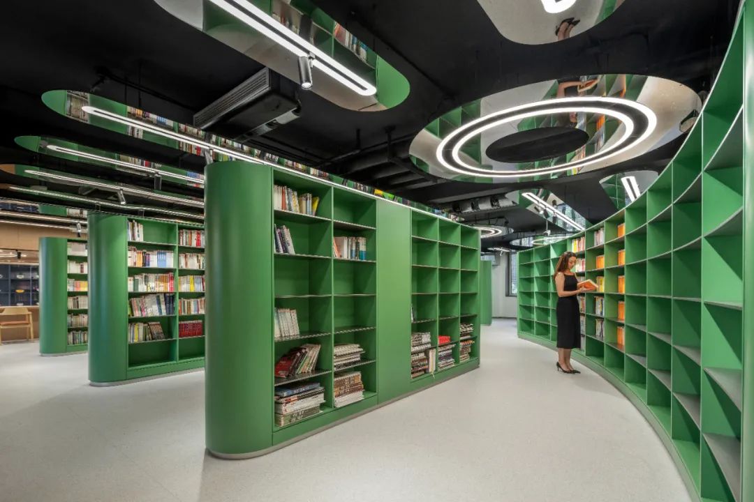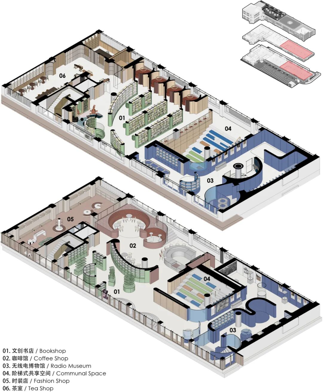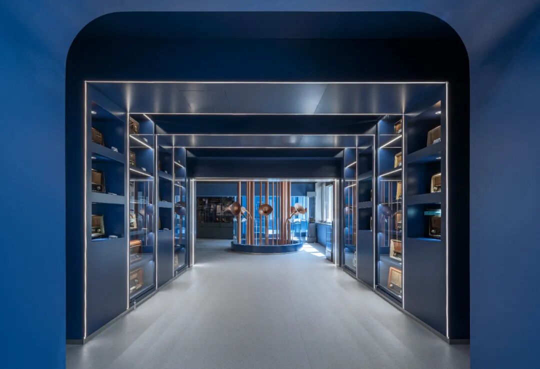 颜色运用是表达设计主题和空间个性的重要手法。我们为每个空间挑选了专属的色彩搭配,形成丰富的视觉感受和空间体验。例如收音机博物馆被赋予了深蓝色,营造出一种关于无线电波的深邃氛围,使参观者自觉地转换到观展的情绪当中。文创书店采用绿色,恰如其分地烘托出文化与艺术的活力。咖啡馆则采用俄式建筑的砖红色,呼应大连这座城市与俄国的历史渊源。