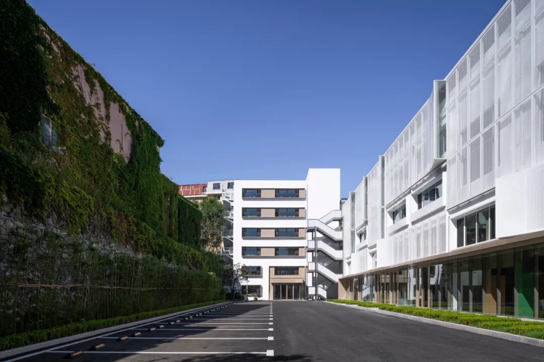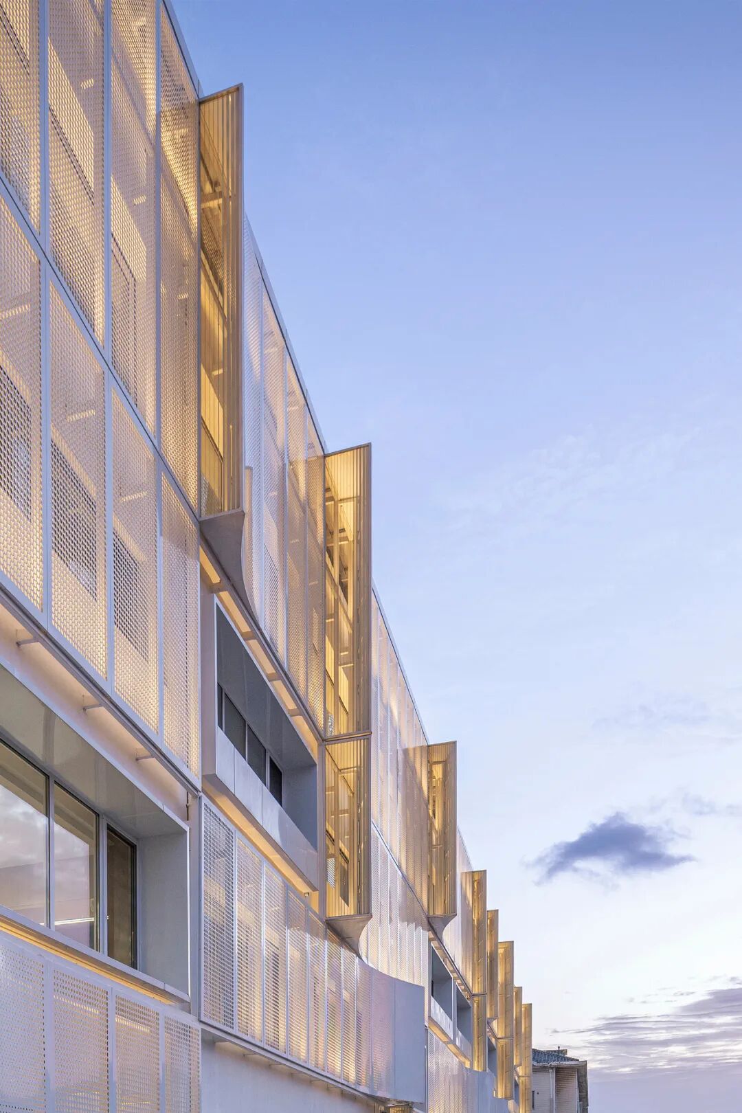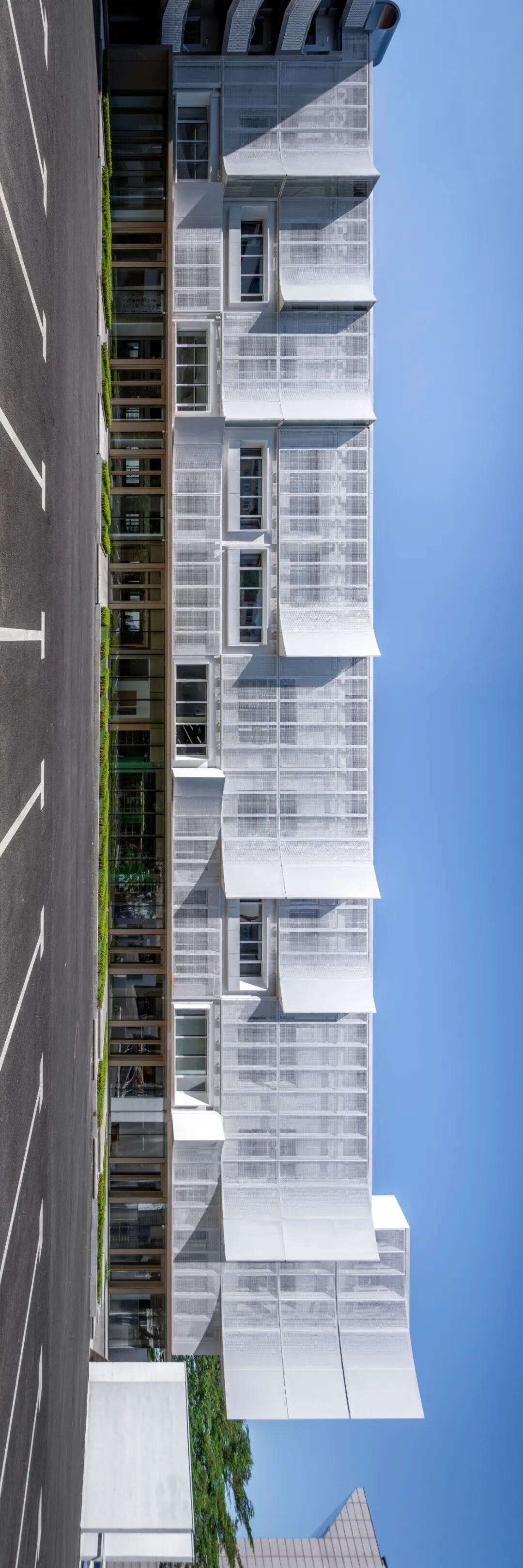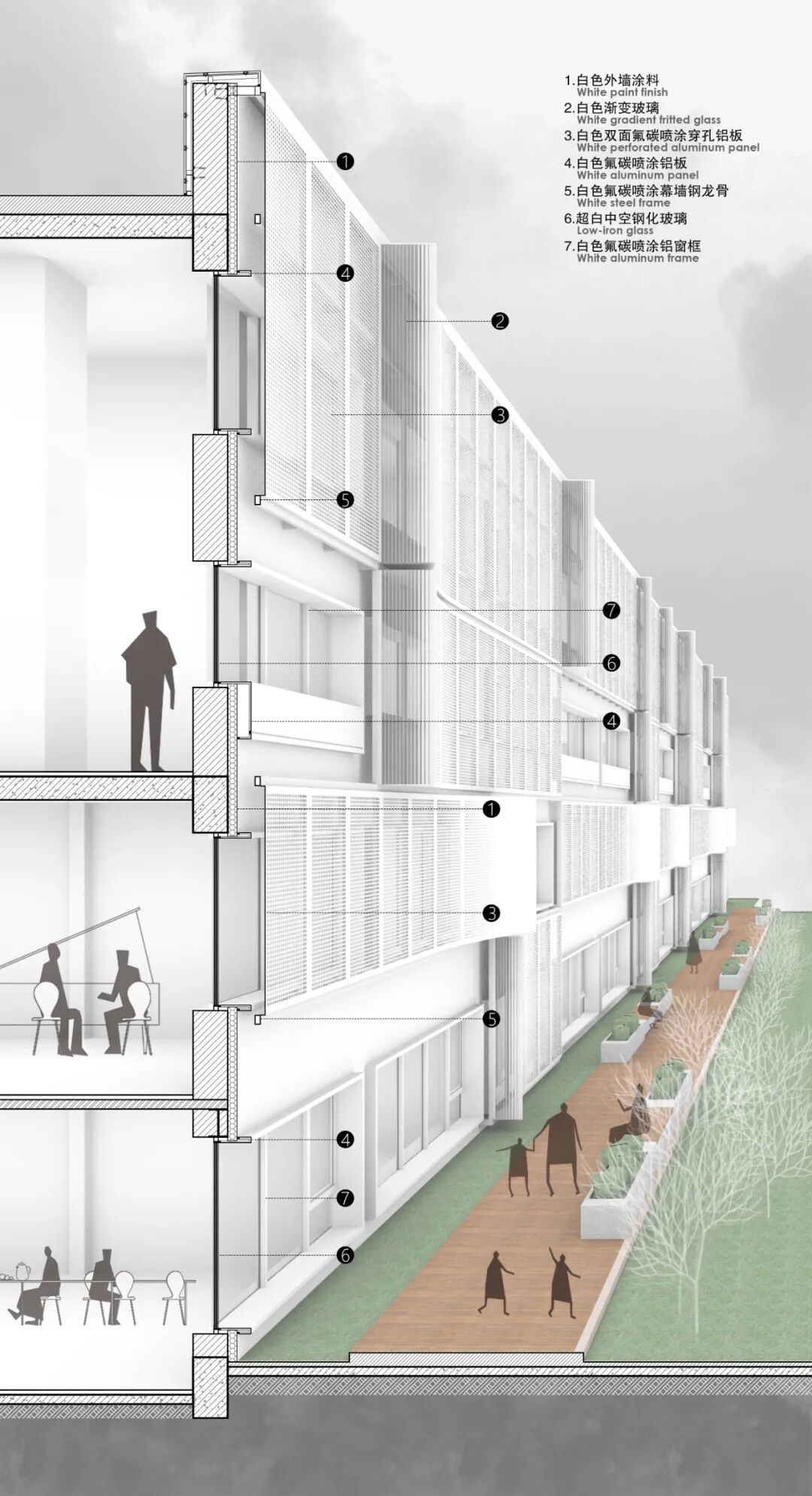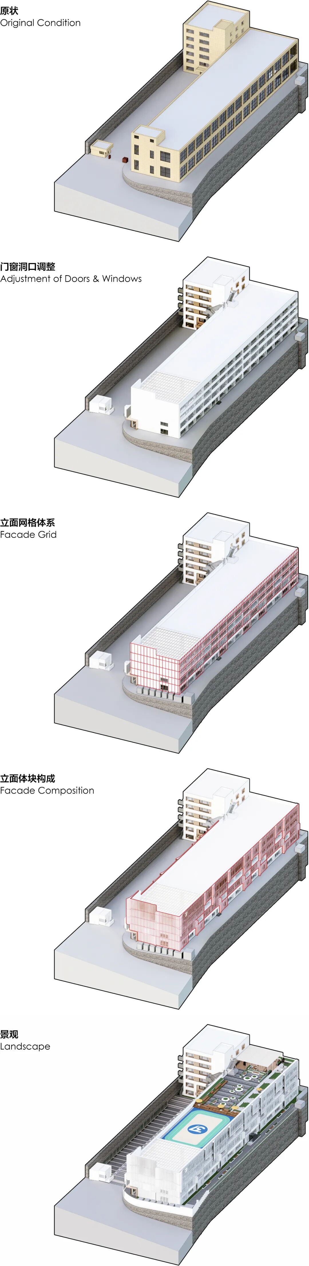 改造策略的下一步是立面的体块构成。我们引入白色穿孔铝板和套窗这两种体块组团,基于立面网格,运用这两种组团排布出随机交错的形态,将原本单调的长立面转变为丰富的光影与材质的视觉体验。