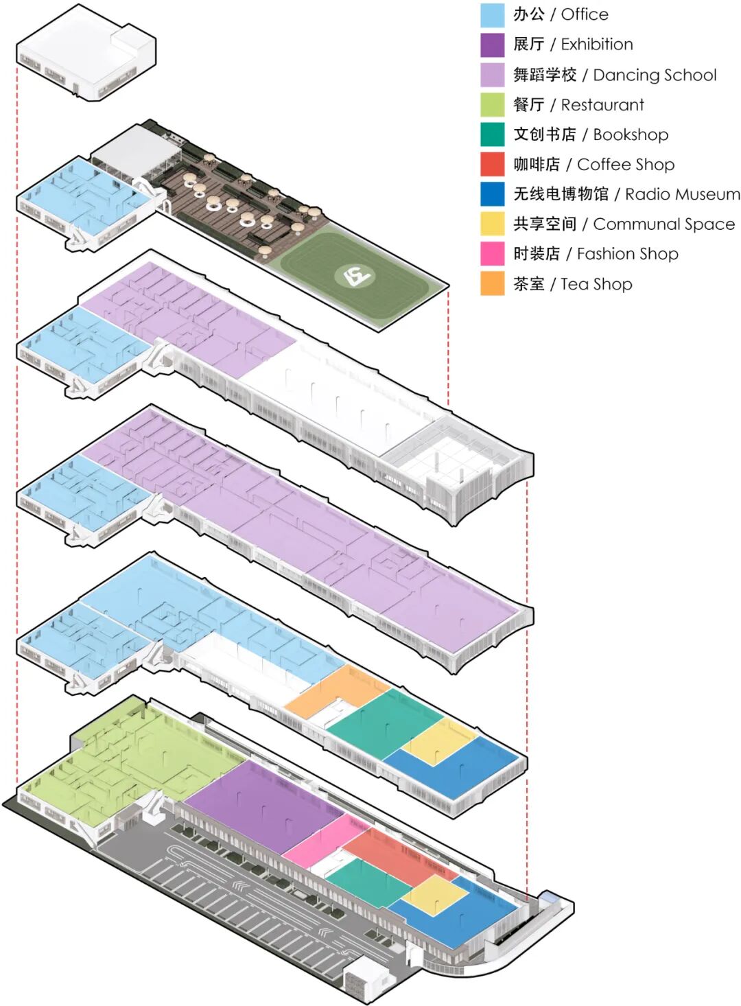 复合业态是保证园区活力的重要前提,每一种业态适合不同的目标人群,通过资源合理配置和共享,不同业态之间互为导流,获得合力效应。大连三十七相包含办公、收音机博物馆、咖啡馆、文创书店、报告厅、茶室、时装店、艺术教育等组合业态,强调“融合性空间”这一主题。