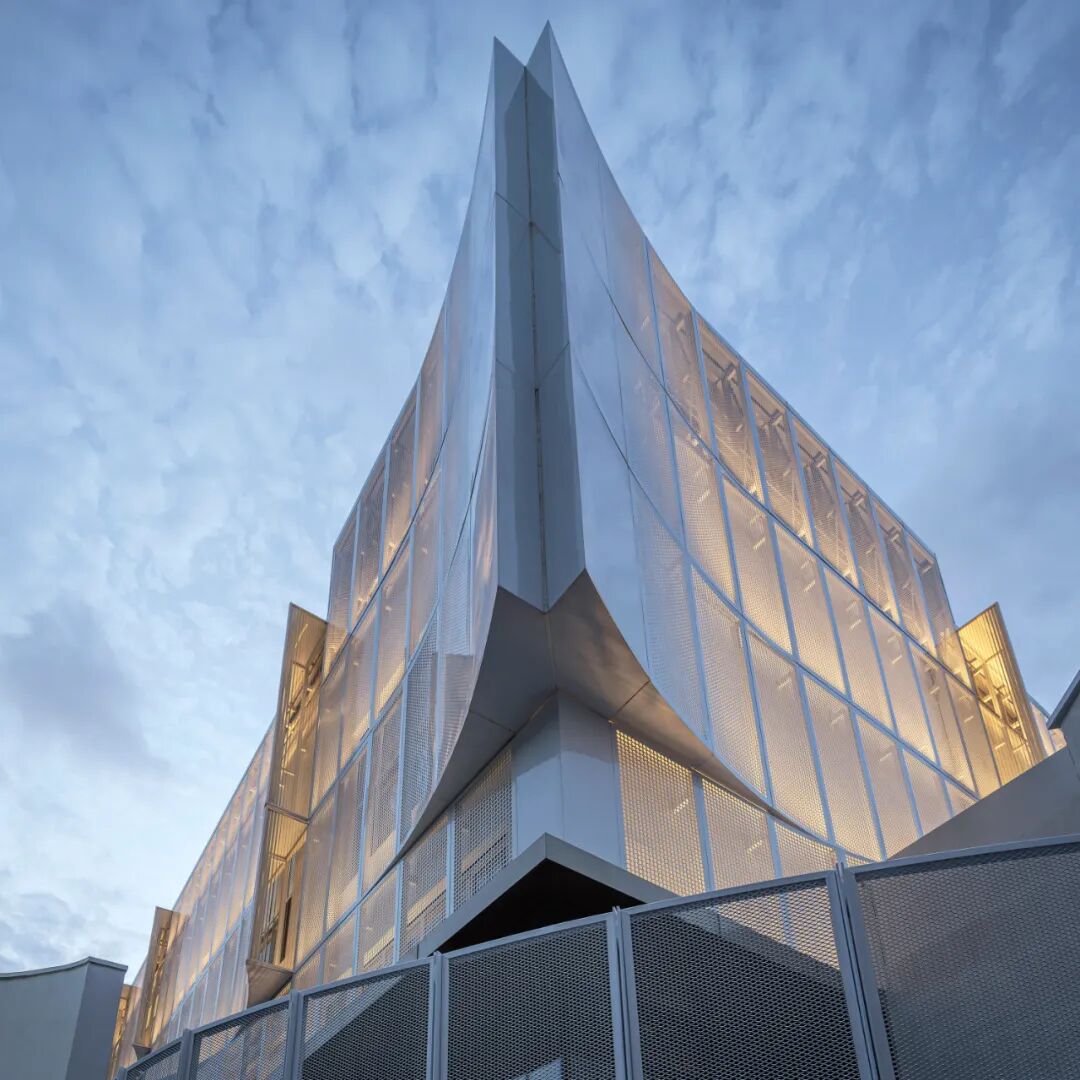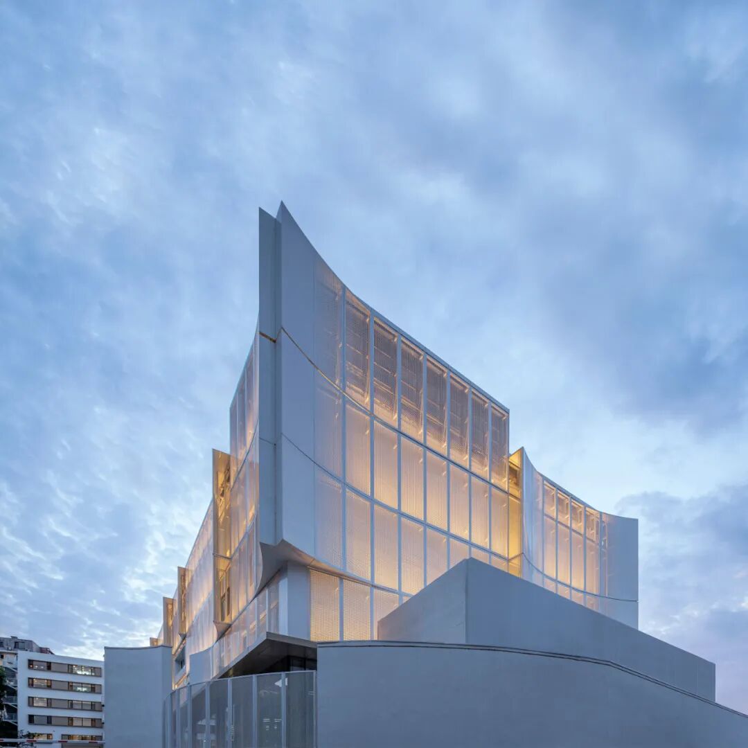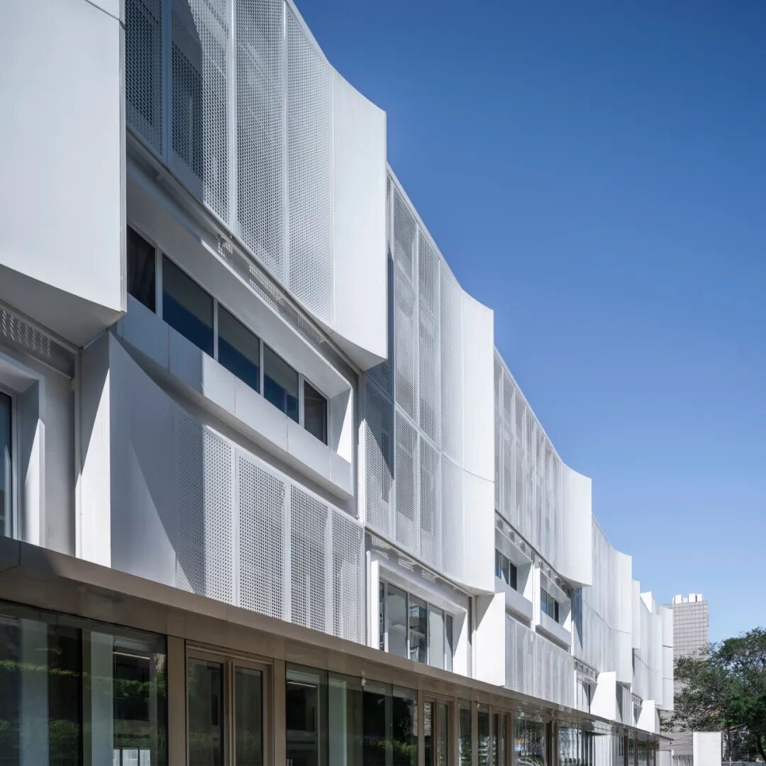 作为幕墙中最为重要和显著的元素,白色穿孔铝板组团被设计成起翘的形态,并且铝板的冲孔率随着起翘逐渐变小,过渡到实面铝板。这种形态的组合使人联想到波浪的涌动,亦或层叠的风帆。在起翘铝板的侧端,采用条纹渐变的彩釉玻璃,叠加出更为细腻的层次。在建筑东南角,两个方向的“波浪”由此交汇,形成了建筑的制高点与视觉核心。