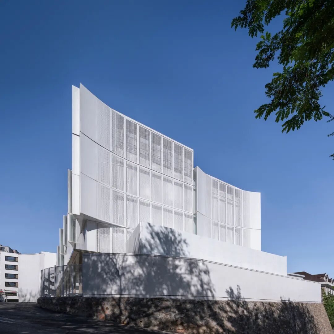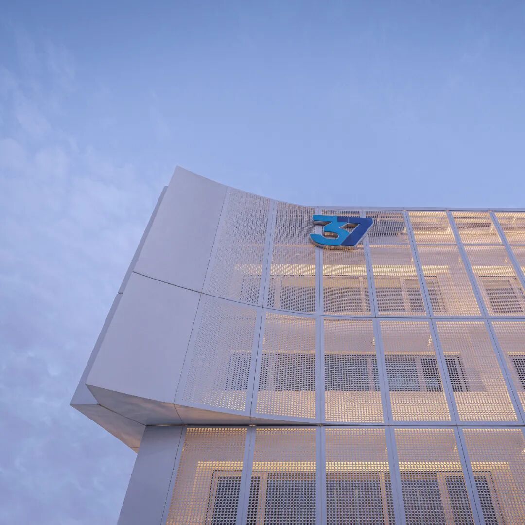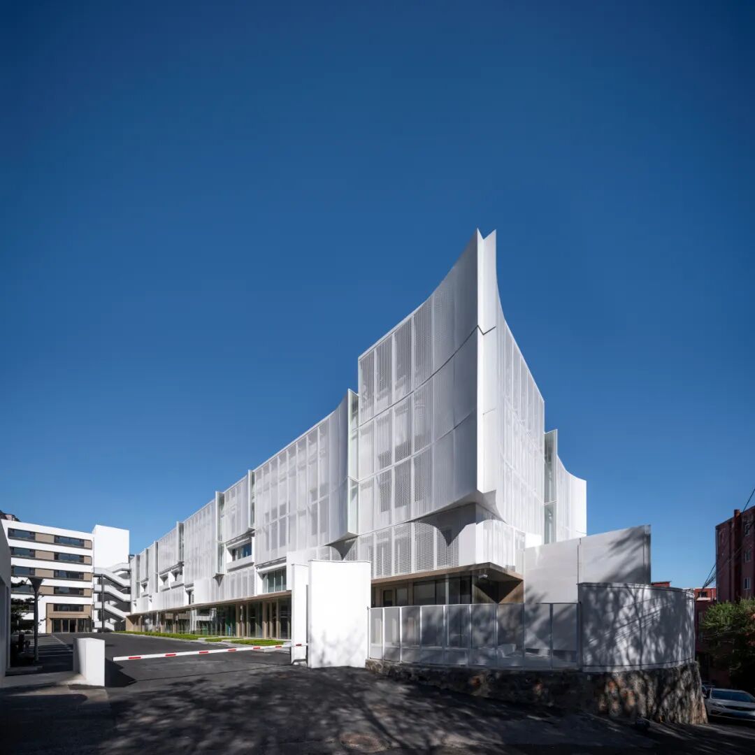 作为幕墙中最为重要和显著的元素,白色穿孔铝板组团被设计成起翘的形态,并且铝板的冲孔率随着起翘逐渐变小,过渡到实面铝板。这种形态的组合使人联想到波浪的涌动,亦或层叠的风帆。在起翘铝板的侧端,采用条纹渐变的彩釉玻璃,叠加出更为细腻的层次。在建筑东南角,两个方向的“波浪”由此交汇,形成了建筑的制高点与视觉核心。