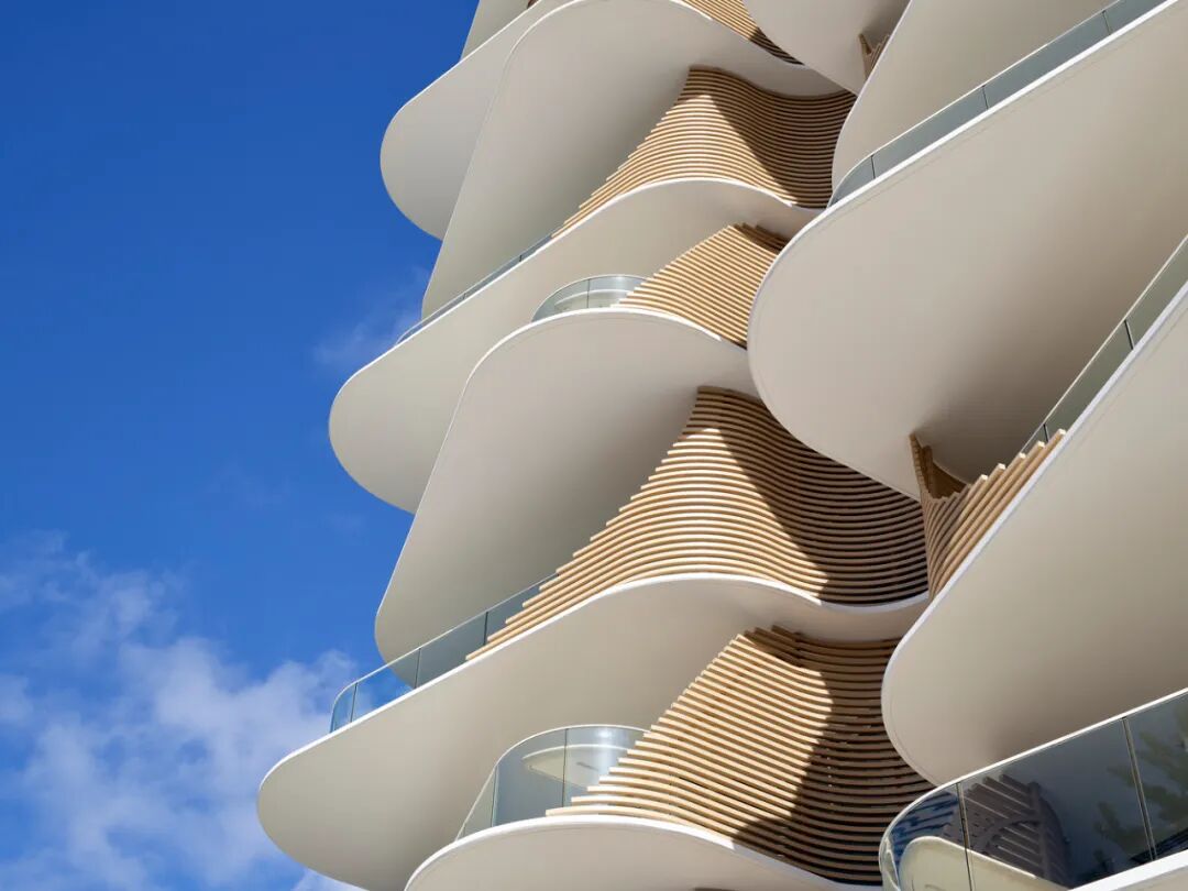 此外,逐渐变窄的板边缘突破了玻璃栏杆及阳台的曲线,并将自然和环境光线映射入公寓的深处。蜿蜒的水平板条则构成了这栋如雕塑般建筑的中心脊柱,并突出了设计的有机表达。在夏天,这些水平板条可以充当遮阳元素,并提供隐私感,同时这一元素也可以发散大自然的魅力,让人们欣赏到不间断的海景。