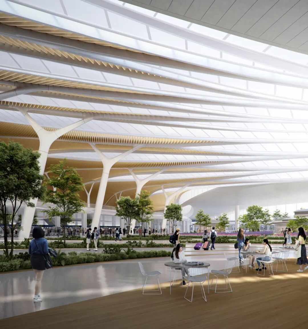 地面交通中心(GTC)汇聚了高铁、城市地铁、机场巴士等城市交通。人们可从市区直达同一轴线的航站楼和酒店,为人们绿色出行提供前提条件。GTC内退台花园式的布局,让景观与不同业态的功能完美结合,为出行旅客提供舒适放松的休闲场所。
