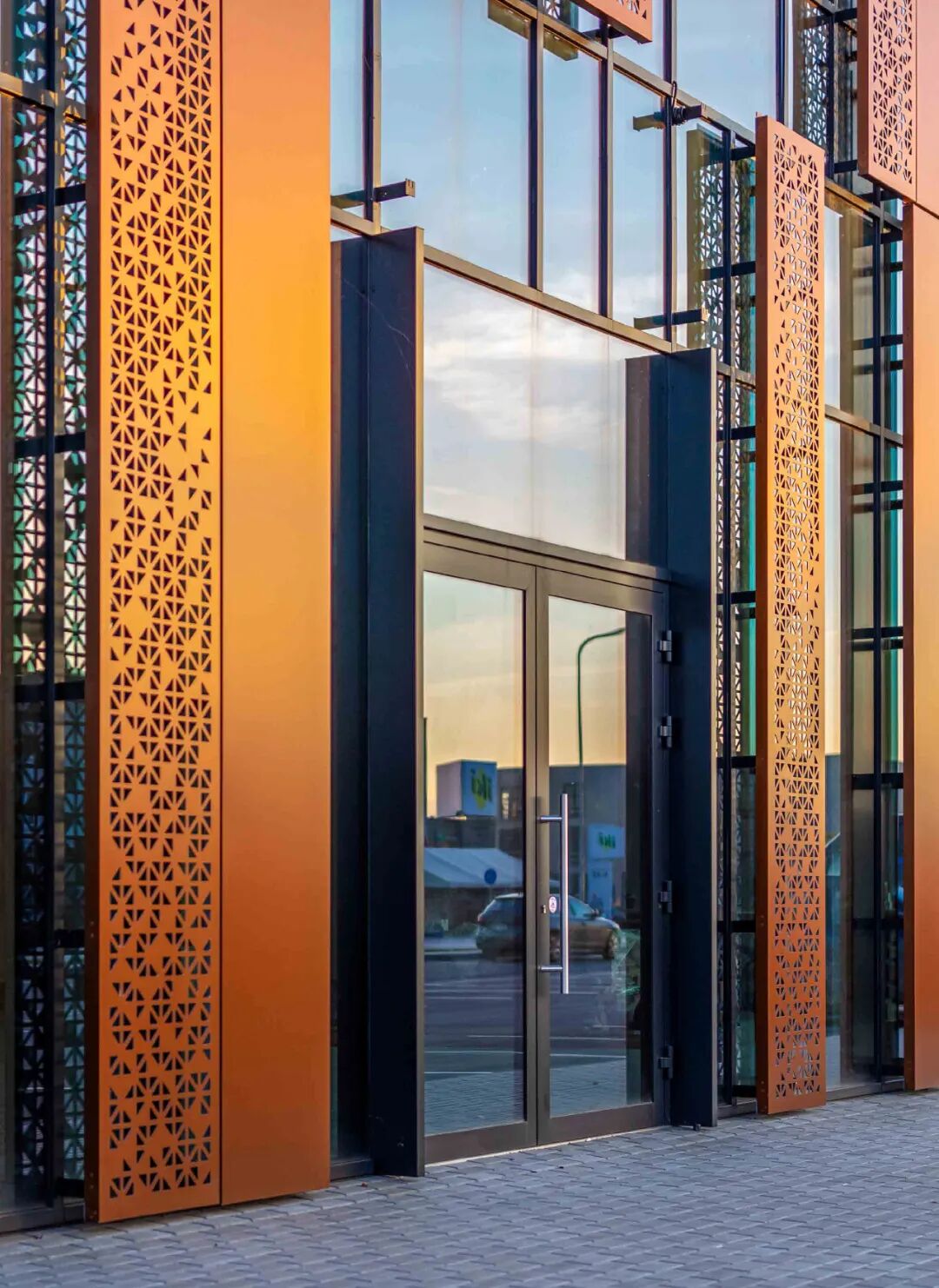 为了使玻璃盒子更具光彩,建筑师在玻璃幕墙外部放置了仿铜拉丝金属复合板制成的垂直条形面板,并做窗棂状穿孔处理,兼具装饰及遮阳的功能。