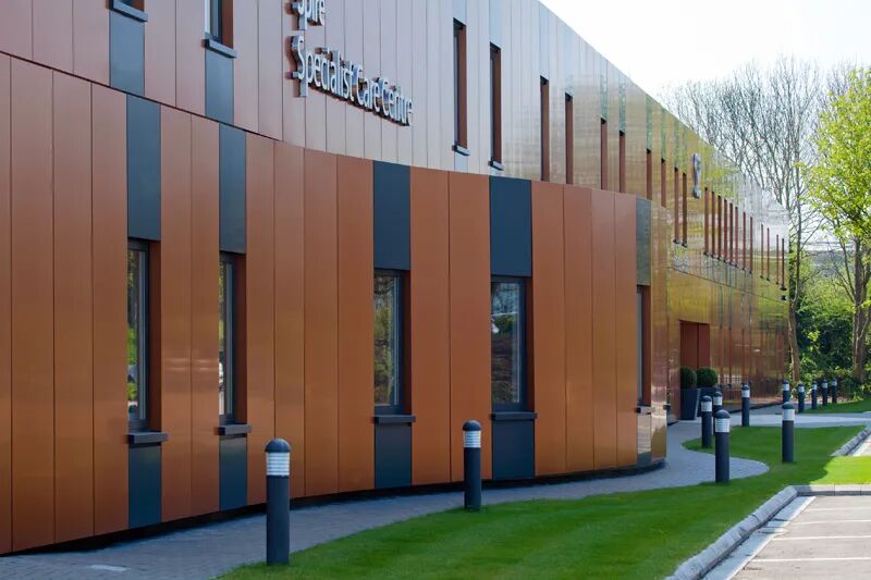 尽管护理中心想尽可能地表达自己的个性,但设计师为了使新建筑尽可能地与周边环境融合在一起,重新评估了相邻砖砌建筑的色调,最终采了仿铜拉丝的铝复合材料,以长条状的面板包覆于建筑立面。