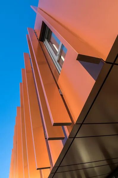 而最让人印象深刻的是包覆在外立面的装饰材料,这个垂直的遮阳线条同样是仿铜拉丝铝复合板加工而成。