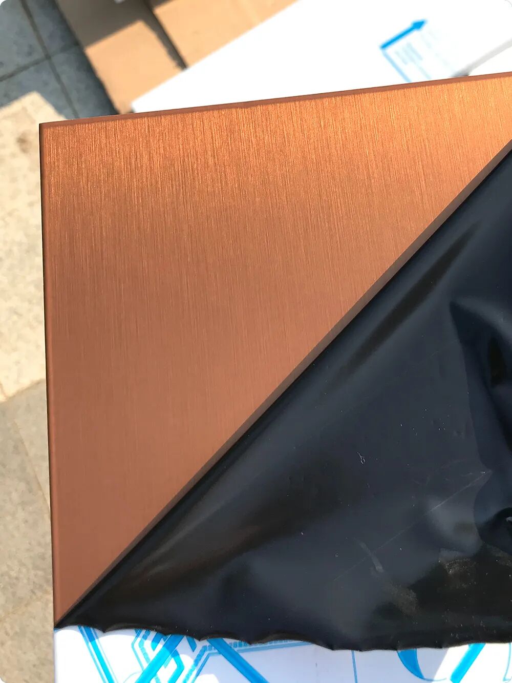今天带大家观筑的是一款仿铜拉丝的铝复合板,它是以0.5厚的铝合金面板,表观处以铜拉丝的自然美感,与不燃型或阻燃型矿物聚合物芯材复合而成的新型建筑装饰材料。