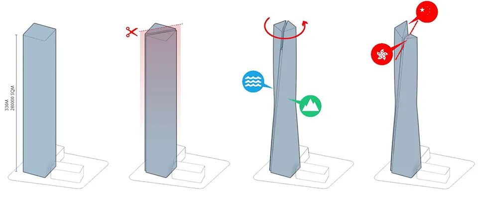 △ 塔楼的两个造型体块从地面向天空旋转上升